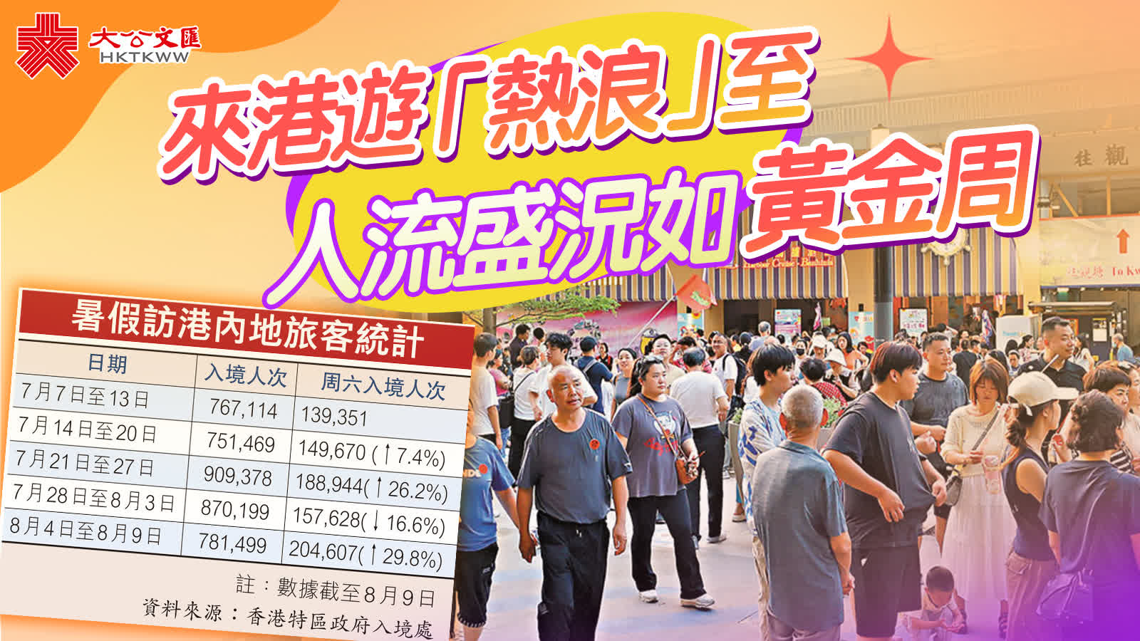 香港遊持續火爆,入境處數據顯示,前日(9日)周六有204,607人次內地旅客訪港,較8月2日增加近三成。昨早周日也有不少內地家庭、旅行團選擇來港,蓮塘香園圍口岸成為熱門通關點,當中不乏手持旅行團旗幟的團客。