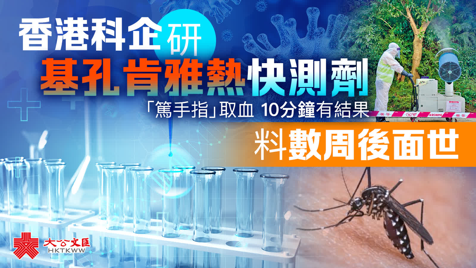 全球現時未有準確的基孔肯雅熱快速檢測。本港的生物科技公司「相達生物科技」董事長及首席執行官招彥燾接受《大公報》專訪時透露,正在研發基孔肯雅熱快速測試劑,大致完成抗體及抗原測試,形容距離研發成功已經進入最後階段,預期快測試劑最快數個星期內面世。