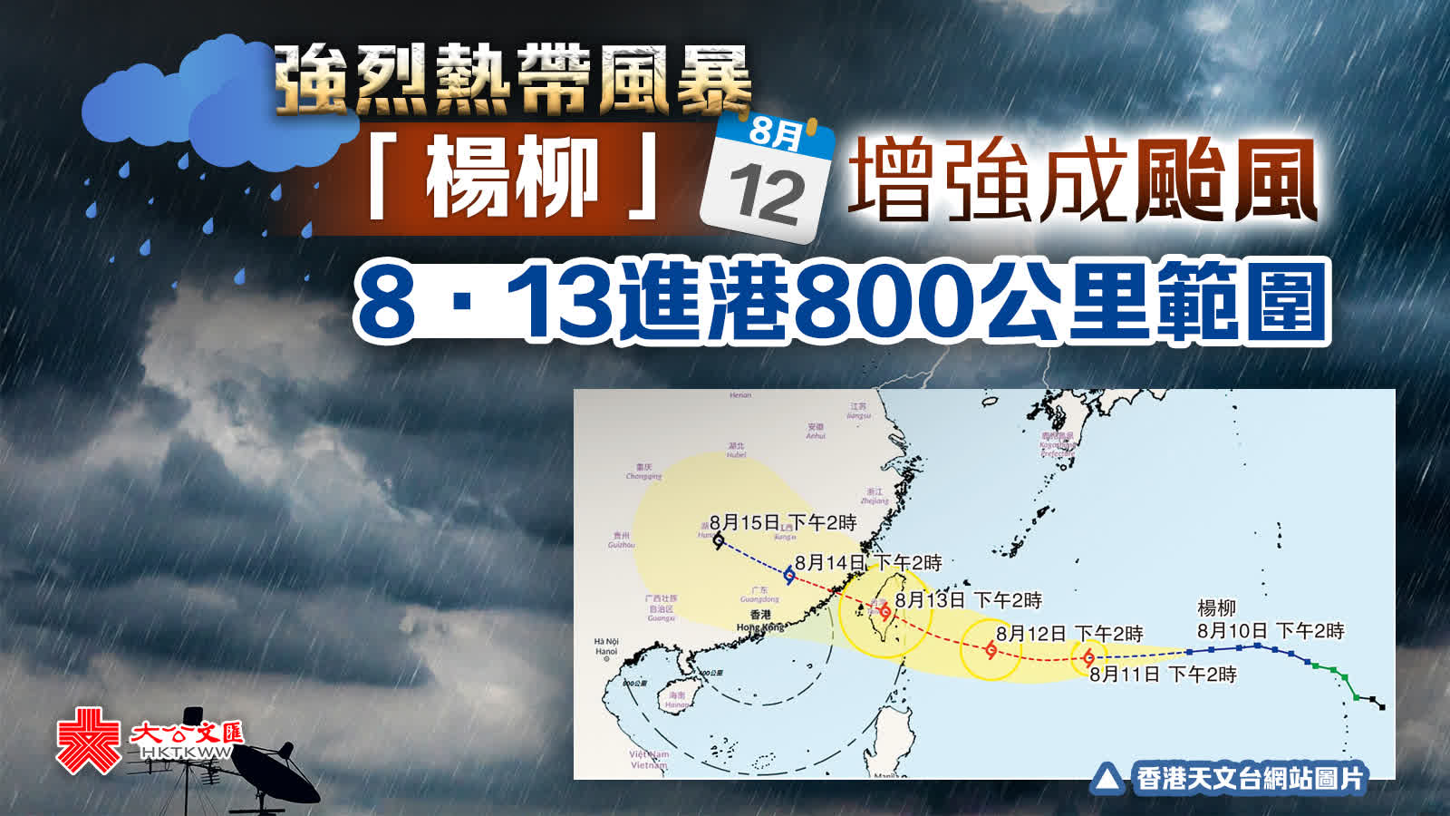 (香港文匯報記者 蕭景源)截至昨日晚上8時,強烈熱帶風暴「楊柳」集結在沖繩東南偏東約1,000公里。香港天文台預測「楊柳」明日會增強為颱風,本周三(13日)會以颱風級別進入本港800公里範圍,其附近最高持續風速達每小時130公里,當日將掠過台灣地區台東及台南。至本周四(14日)在距離本港約400公里,廣東汕頭至福建漳州之間登陸,屆時將減弱為強烈熱帶風暴。