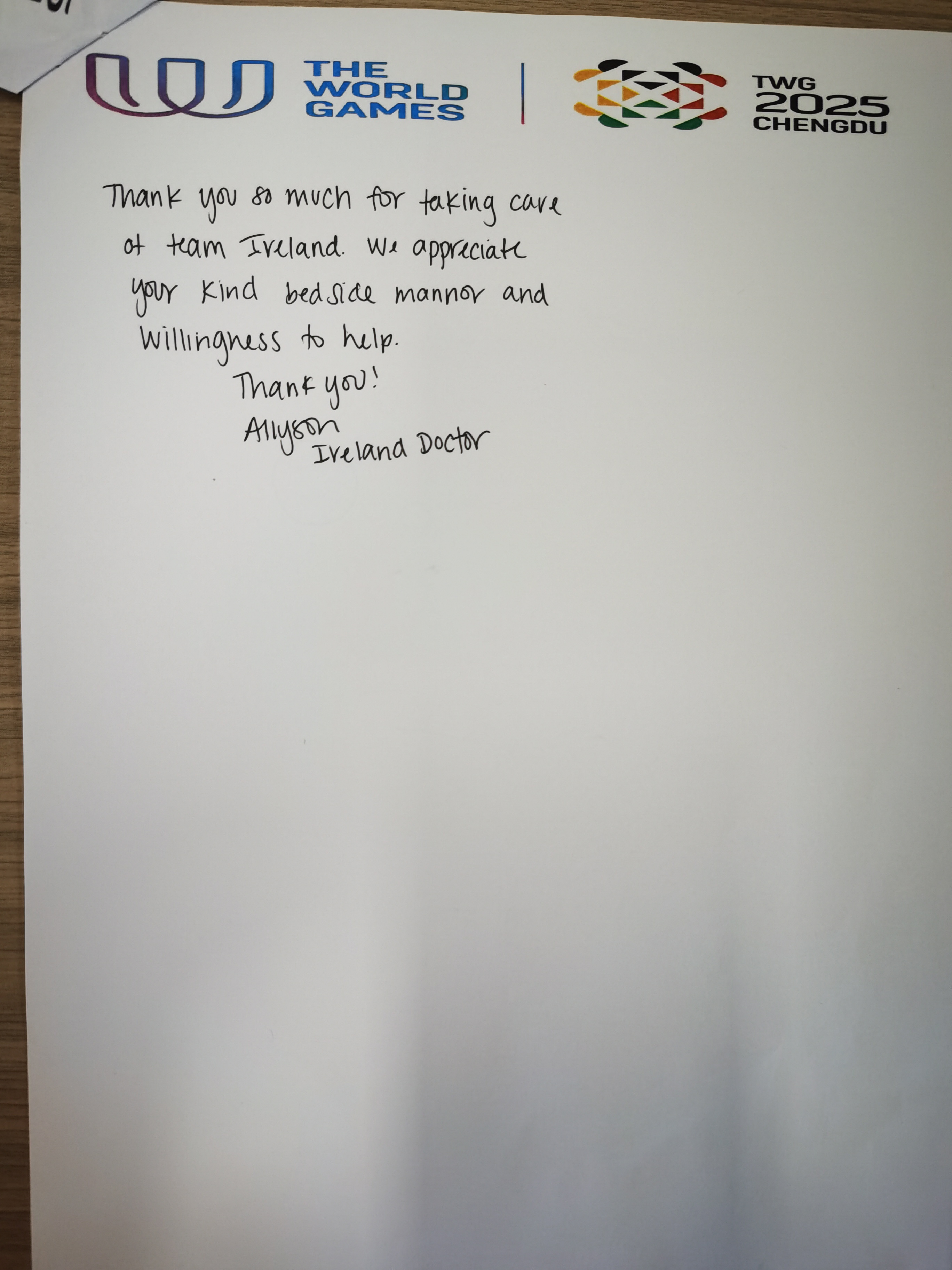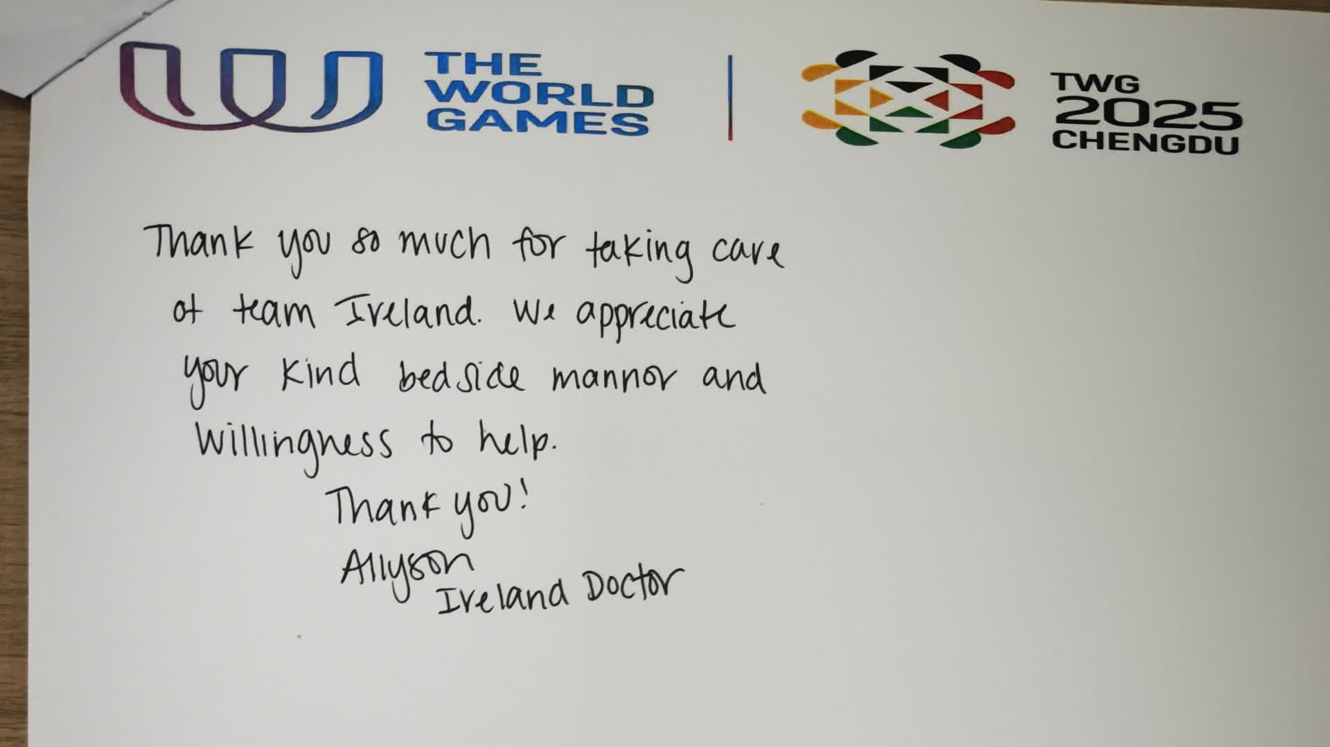 Allyson旁觀了整個高效而溫暖的救治過程,令她十分感動。她主動走到服務台,翻開嶄新的意見簿,在扉頁留下了發自肺腑的感言。這份沉甸甸的「跨國謝意」,成為對該醫療保障點乃至成都世運會保障工作最有力的肯定。
