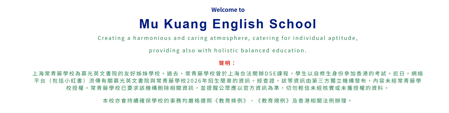 大公文匯全媒體報道,近日網傳一份招生簡章,聲稱由觀塘直資中學「慕光英文書院」與內地「上海常青藤學校」合辦DSE課程,由慕光提供香港本地學籍,常青藤提供寄宿及全科補習等。慕光英文書院於網站澄清,該章程由第三方獨立機構發布,內容未經常青藤學校授權,已要求刪除。