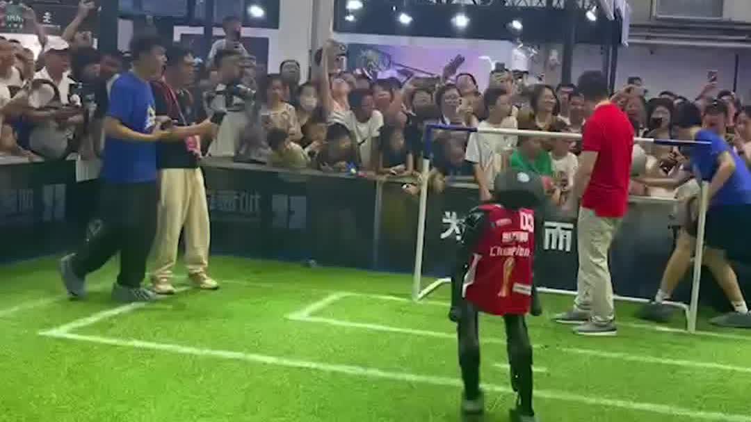 (大公文匯網 記者 郭瀚林)8月11日下午,在2025世界機器人大會上,360創始人周鴻禕現身人氣最旺的加速進化機器人展台,體驗人機足球大戰。比賽現場,戰況激烈。周鴻禕一展靈活盤帶,差點晃過T1機器人。