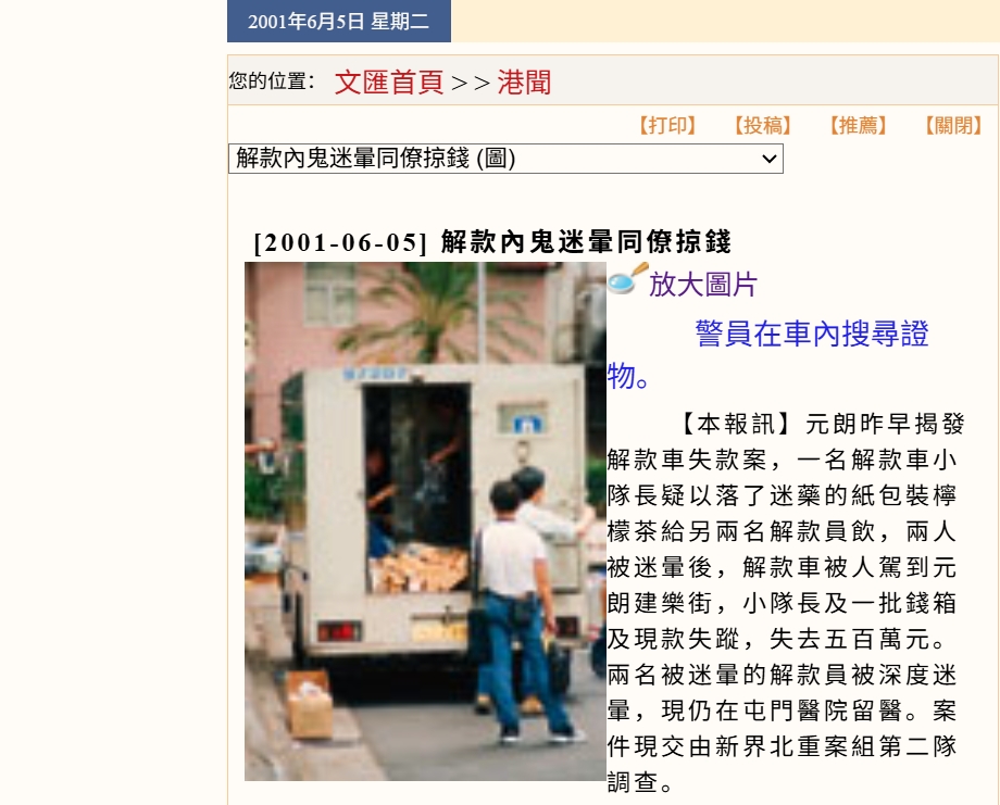 2001年——解款車內鬼檸檬茶「加料」 迷暈同僚掠錢