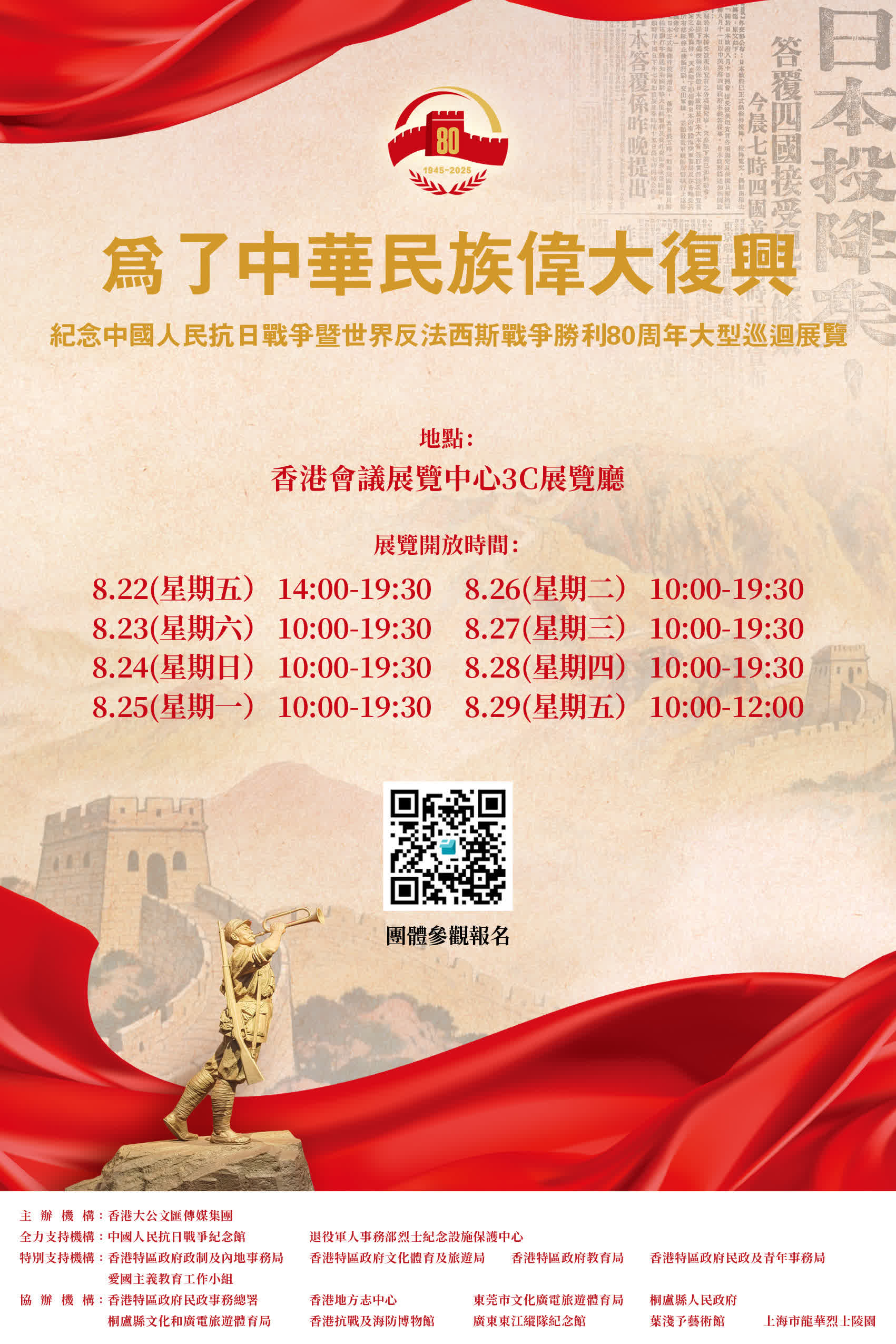 大公文匯網報道,為紀念中國人民抗日戰爭暨世界反法西斯戰爭勝利80周年,由香港大公文匯傳媒集團主辦,中國人民抗日戰爭紀念館、退役軍人事務部烈士紀念設施保護中心全力支持的「銘記歷史 珍愛和平——紀念中國人民抗日戰爭暨世界反法西斯戰爭勝利80周年大型巡迴展覽」將於8月22日至8月29日假香港會議展覽中心3C展廳舉辦。