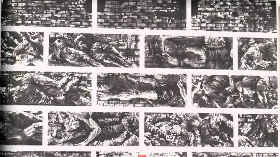 此次展出的畫作由畫家丁品精心創作,分為16組篇章,在結構上巧用象徵手法,以「戰禍」「陷落」「劫難」「呼喚」等16個系列段落構成整體敘事,把1937年12月日軍攻佔南京後殘破的城牆作為核心意象,在布滿彈痕的牆體上,磚形獨立畫面錯落交織,既形成視覺上的強烈衝擊,又凸顯歷史記憶的碎片化與厚重感。