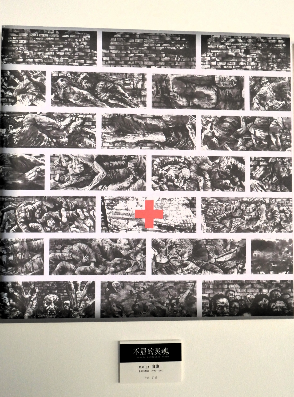 本次展出的作品以黑灰色為主調,唯有一幅《血旗》中畫着一枚格外鮮明的紅十字。「88年前,20多位外籍人士冒着生命危險留在南京,開展人道主義救援,他們彰顯了人性大愛。」丁品說,「這面在戰爭中屹立的紅十字,就是生命的象徵。」