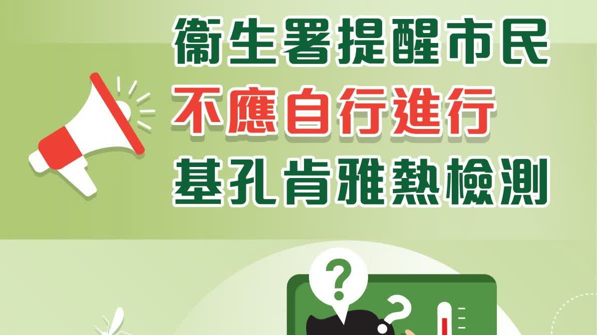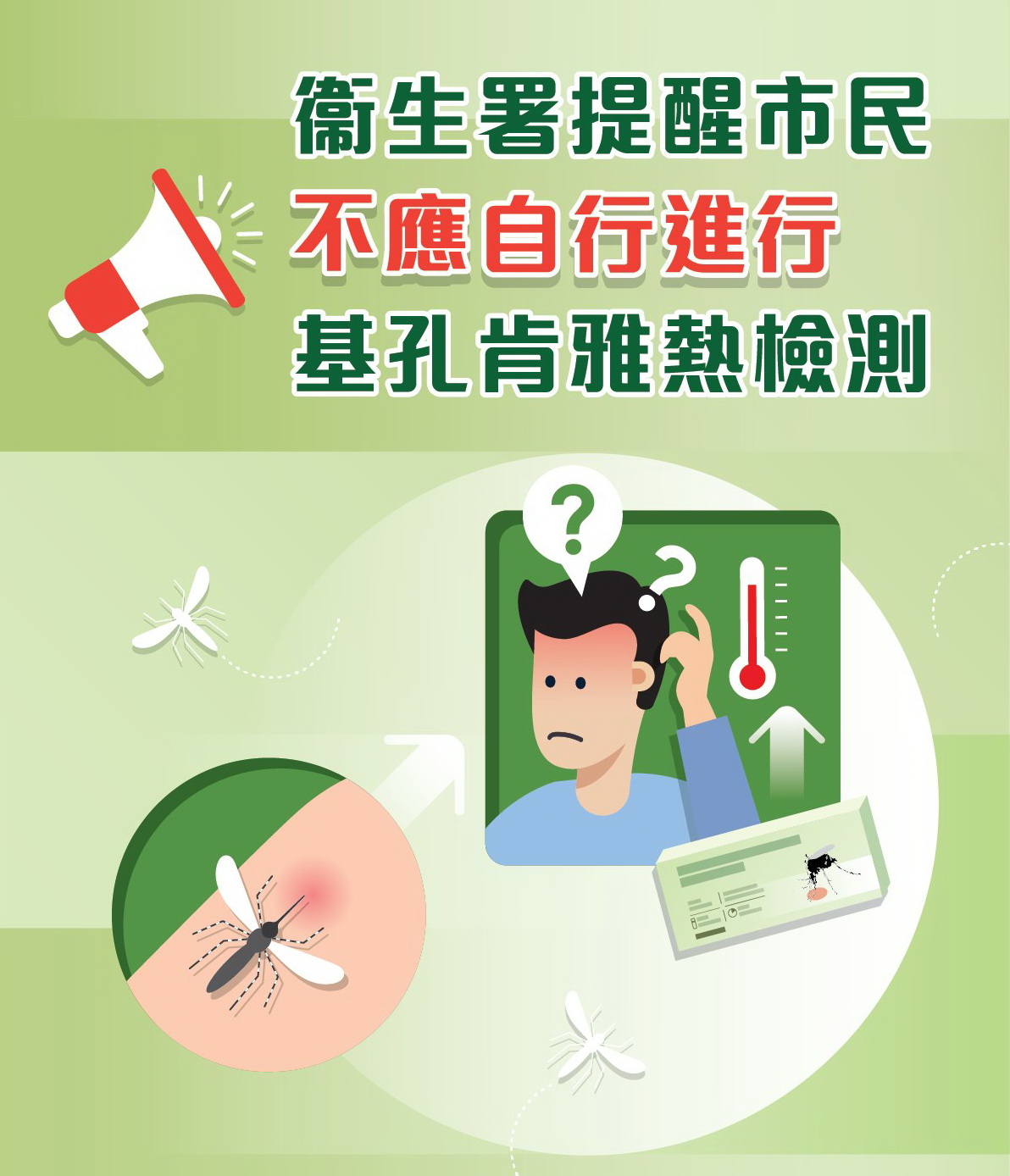 中心發言人說:「目前,市面上並沒有獲國際衞生當局認證的快速測試產品,供市民自行測試基孔肯雅熱。對於有網上廣告表示有出售聲稱可供市民自行測試的基孔肯雅熱快速測試產品,衞生署已即時向有關生產商了解,該生產商確認有關產品並非供市民作自行測試用途,該生產商並已通知有關香港供應商暫停在本港零售該產品。」