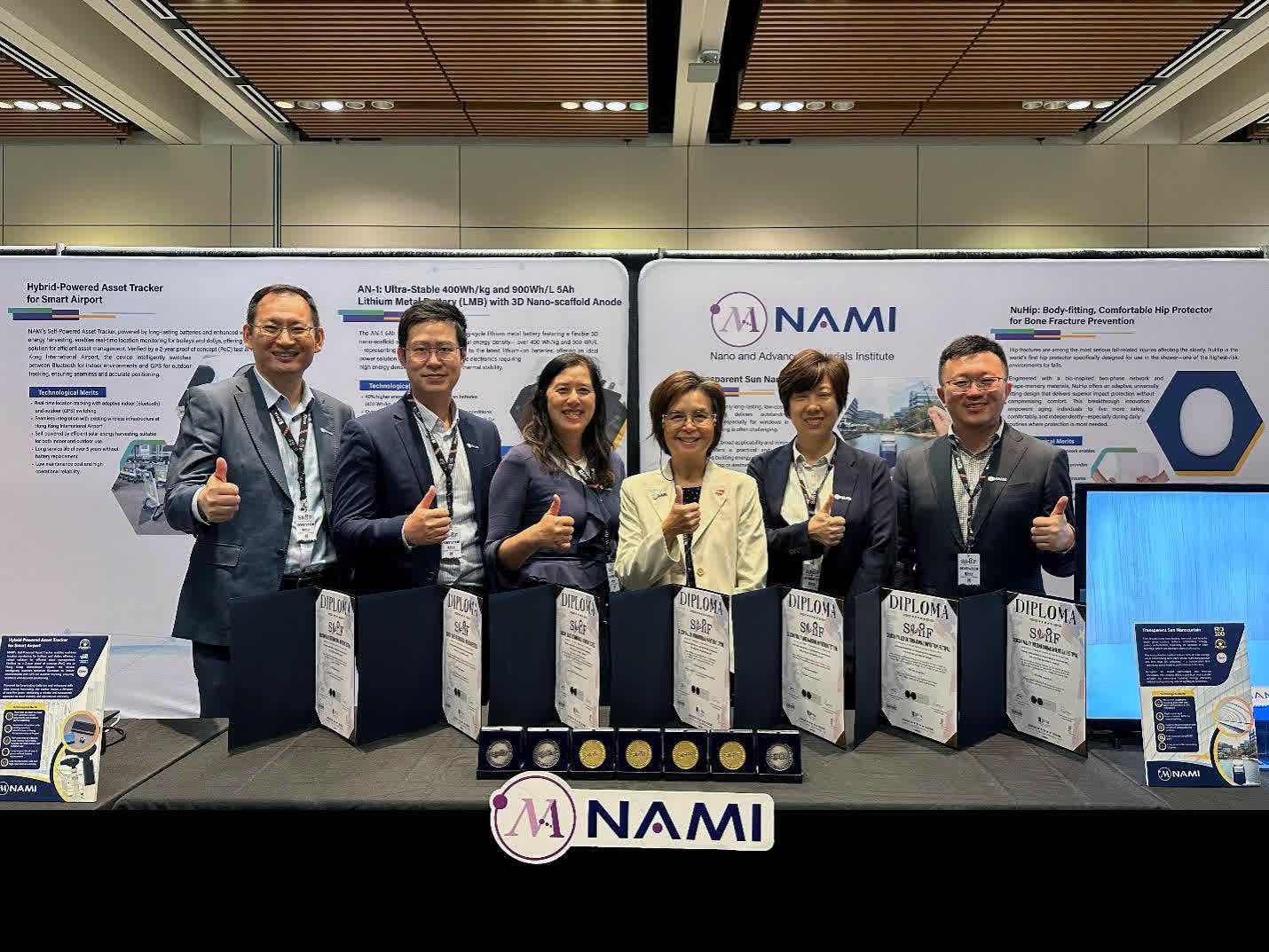 NAMI在此次SVIIF展出多項創新技術,涵蓋醫療保健、電池材料、先進電子及可持續材料等領域。其中,獲金獎的技術包括智慧機場自供電資產追蹤系統,貼身、舒適、可預防骨折的髖部保護器,透明透光納米窗帘,以及及NAMI-SUPERTHERM浸沒式冷卻液。獲得銀獎的技術為具有3D納米骨架陽極的超穩定400Wh/kg、900Wh/L安時級鋰金屬電池,3D打印高級純素生三文魚片,以及防水、防油、斥菌紙包裝塗層。