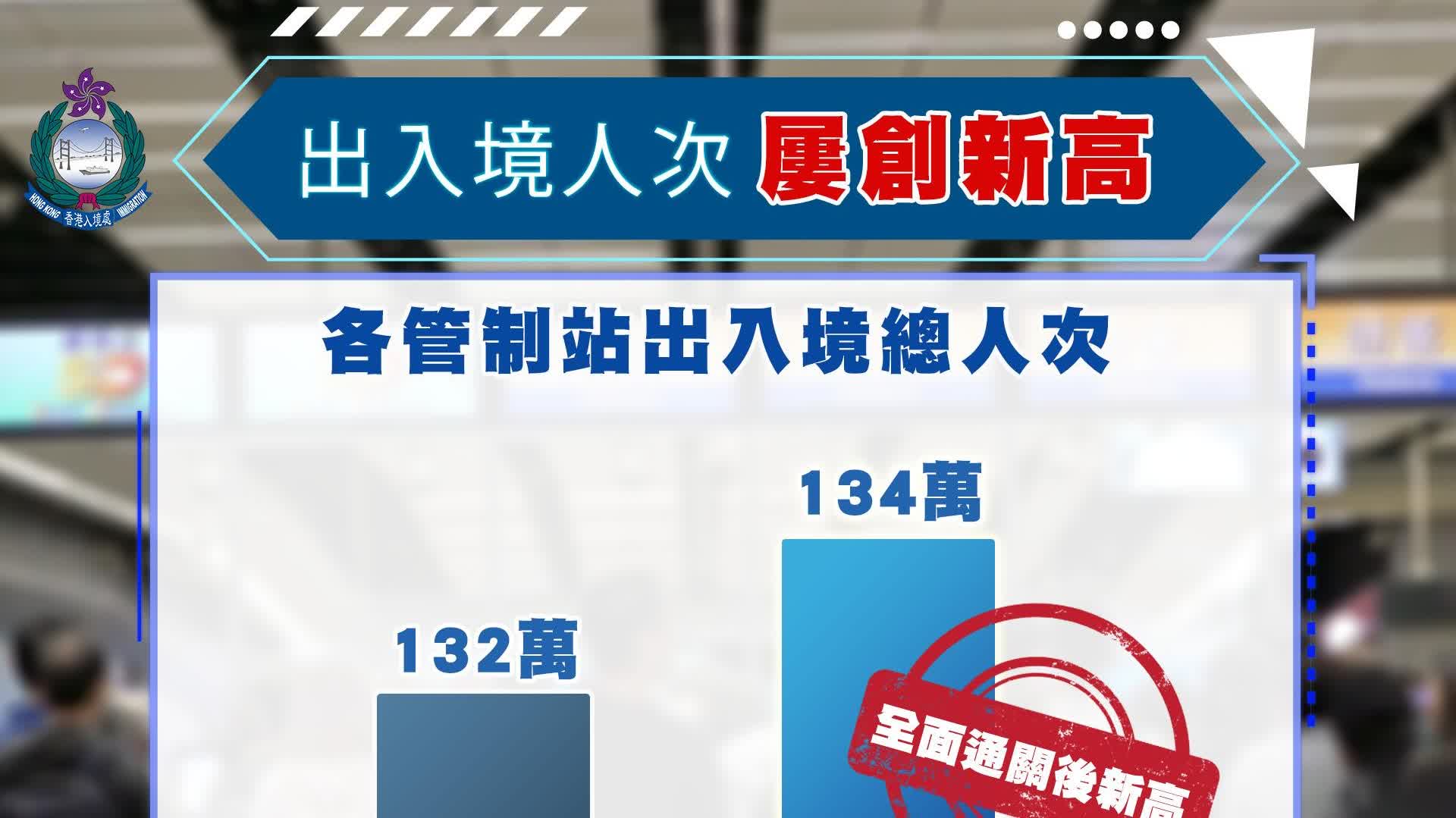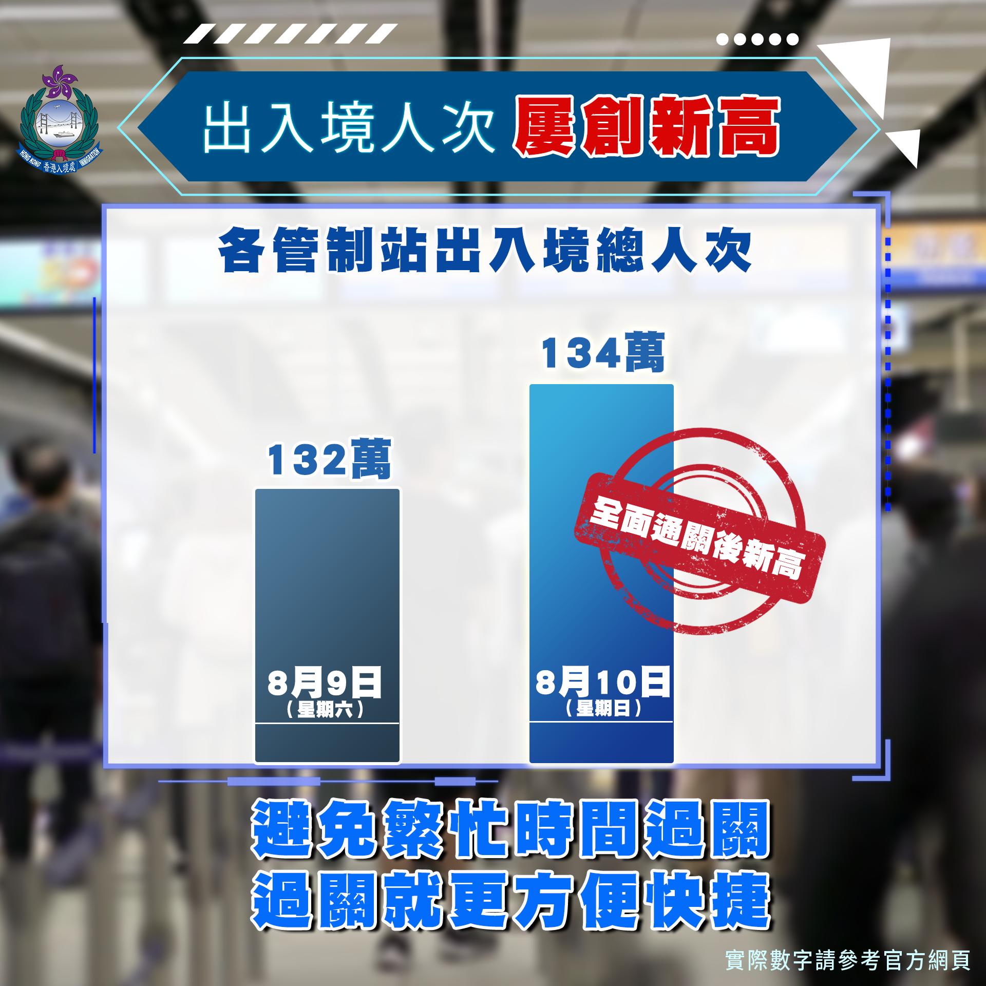 進入暑假後段,過去的週末(8月9和10號),我們分別錄得超過132萬和134萬人次經各管制站進出香港,再度創出全面通關後的新高。