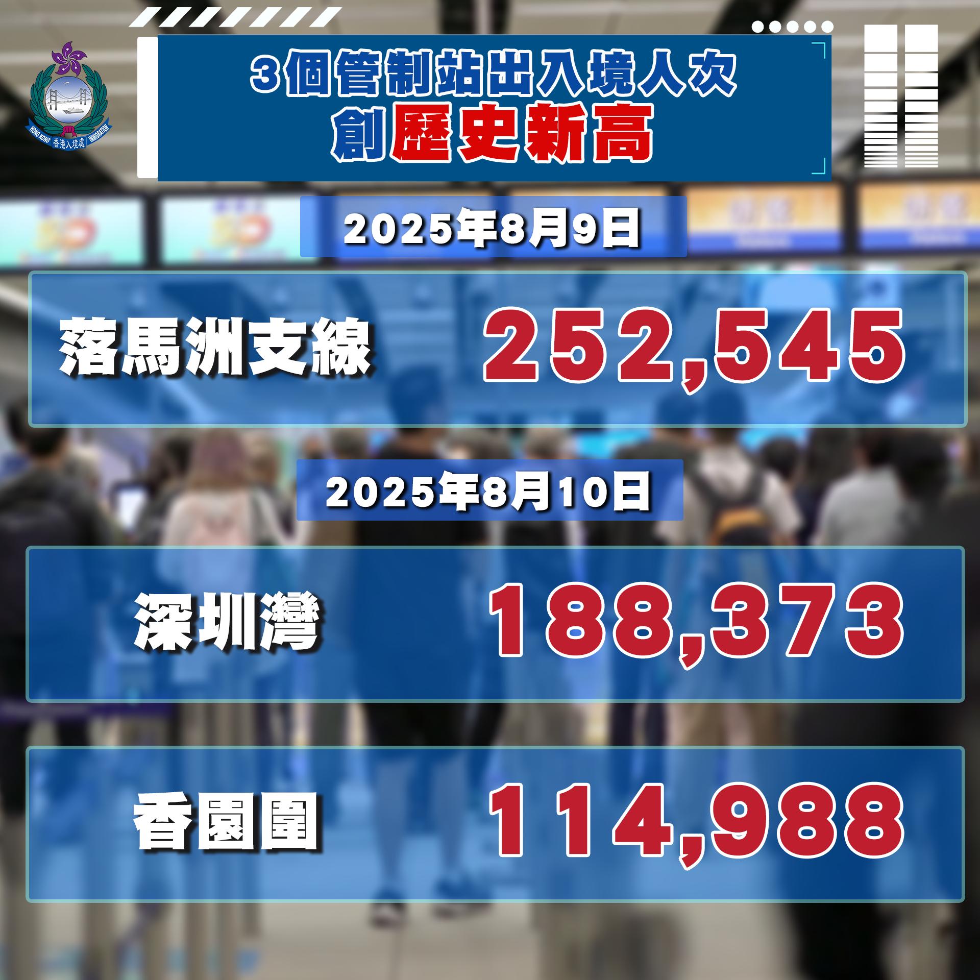 當中落馬洲支線(2007年啓用)8月9號、以及深圳灣(2007年啓用)和香園圍(2023年開始客運通關服務)在8月10號的出入境人次更突破了各自開通以來的紀錄!