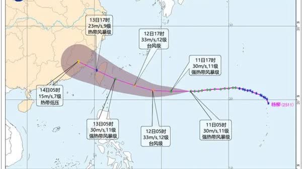 大公文匯全媒體報道,今年第11號颱風「楊柳」目前為強熱帶風暴級,中央氣象台預計,「楊柳」將以每小時25公里左右的速度向西偏北方向移動,強度逐漸加強,最強可達強颱風級,將於13日中午前後在台灣東南部沿海登陸(颱風級或強颱風級)。