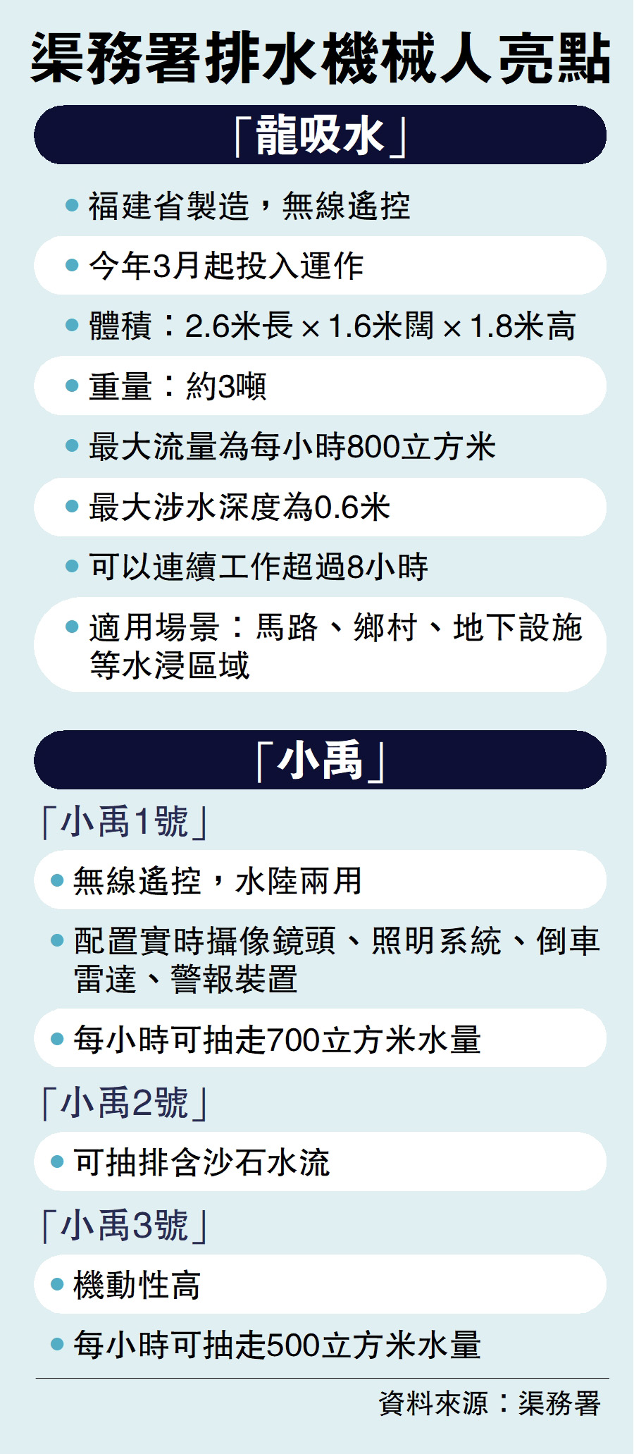 渠務署新界北渠務部總工程師盧秋玲表示,為加強部門應急能力和加快處理水浸效率,該署於今年初引入了一部「龍吸水」,以及三部「小禹」機械人,隨後在7月添置了兩部「龍吸水」,並於8月4日黑雨前抵港,立即派上用場。