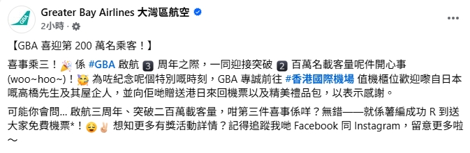 大公文匯全媒體報道,大灣區航空今日(13日)迎來第200萬名乘客,為日本旅客高橋先生,他與家人暢遊四天後返回大阪,大灣區航空管理層代表於機場值機櫃位迎接乘客,並向他們致送來回機票及精美禮品包。大灣區航空亦表示,為慶祝這個里程碑,會於今日下午3時推出機票大放送活動,為期3日,送出多套台北、曼谷或日本任何一個航點的來回機票。