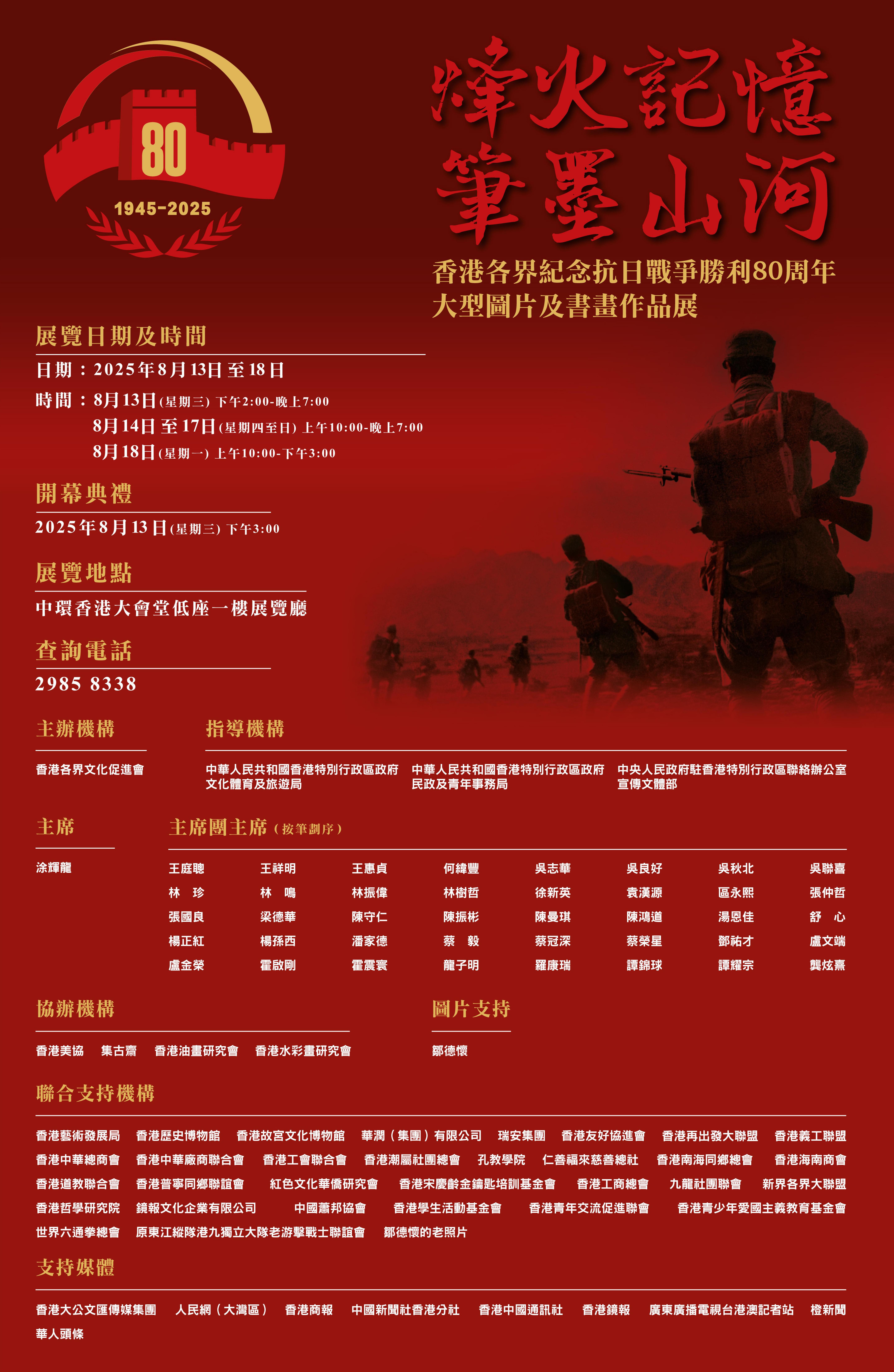 大公文匯全媒體報道,回顧抗戰歷史,弘揚愛國精神。烽火記憶 筆墨山河——香港各界紀念抗日戰爭勝利80周年大型圖片及書畫作品展開幕典禮今日(13日)舉行,展覽將於8月13日至18日展出一眾藝術家之作品,當中包括香港當代藝術家董慧的《彈孔裏的抗聯記憶》。特區政府文化體育及旅遊局局長羅淑佩、中央政府駐港聯絡辦副主任劉光源、香港各界文化促進會主席涂輝龍等出席。