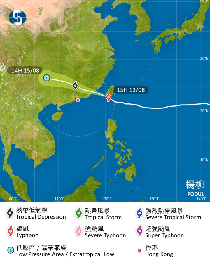 天文台還表示,「楊柳」正橫過台灣海峽,預料會在今日(13日)與本港保持超過400公里左右距離,一號戒備信號會在今日餘下時間維持。天文台會視乎楊柳的減弱速度、與珠江口的距離及本地風力變化,評估是否需要在明早改發三號強風信號。