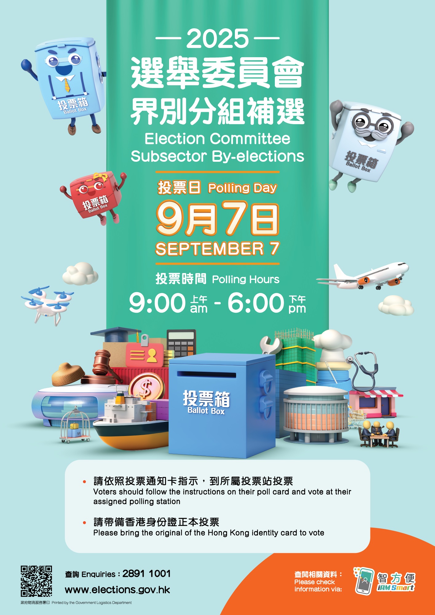 選舉事務處發言人指,選委會界別分組補選將於9月7日進行投票,投票當日會設立5個一般投票站,並沿用合併投票安排:即如果一位界別分組投票人同為另一個界別分組的獲授權代表,可於同一投票站投下兩張選票。一般投票站的投票時間由上午9時至下午6時。