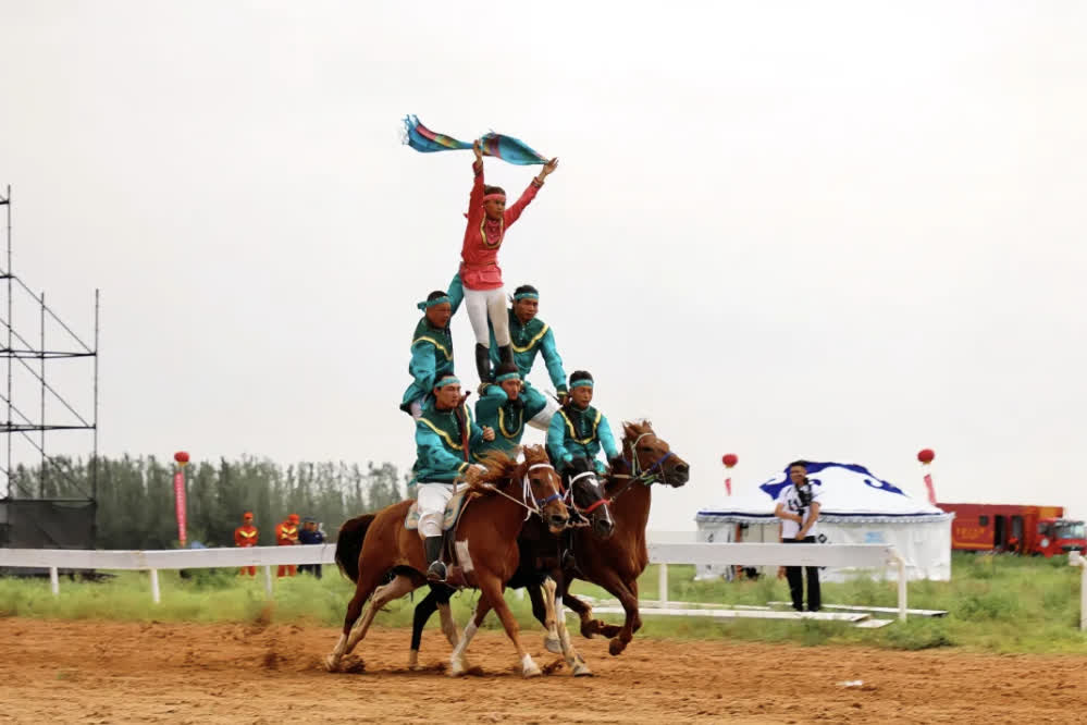 駿馬嘶吼,一場別開生面、熱鬧非凡的馬術表演精彩上演,20名馬術人員駕馭着馬匹登場,馬上倒立、飛速奔跑、站立馬背、馬背倒立、馬上拾哈達、馬背疊羅漢等,一系列高難度動作引得現場掌聲、歡呼聲不斷,寓意鄂爾多斯勇往直前、一馬當先的精神。