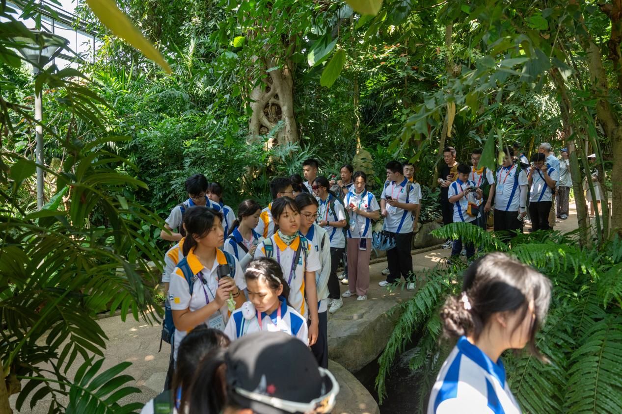 「這裏模擬了熱帶、亞熱帶的氣候環境,匯聚了來自世界各地的奇花異草,是一個濃縮的『植物星球』」。小王老師帶着兩地青少年們去感受了植物界的「絞殺現象」,觸摸附生植物的智慧。