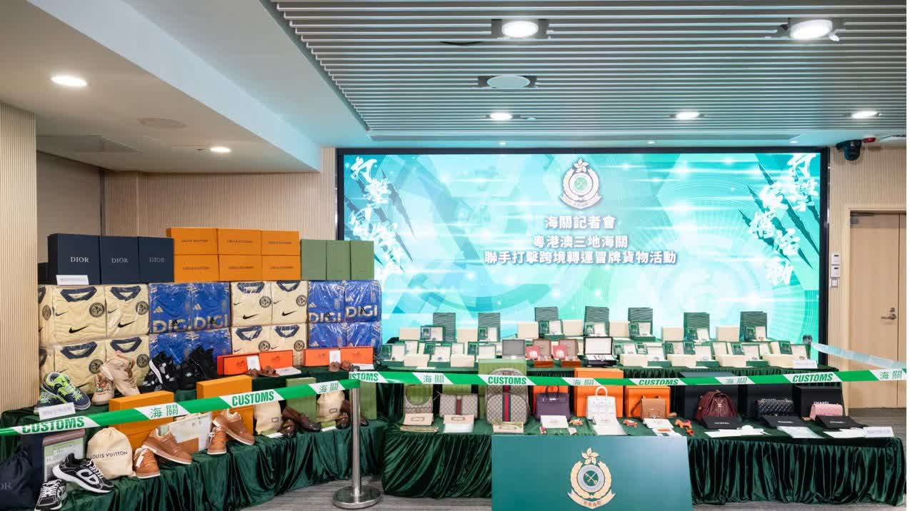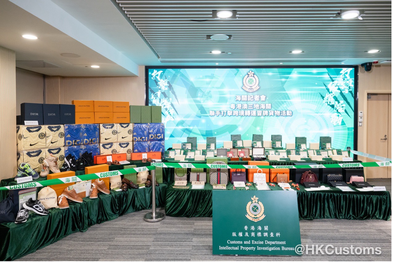 香港海關與內地及澳門海關於七月十八日至三十一日採取為期兩星期的執法行動,加強檢查從三地轉口往美洲、歐洲、「一帶一路」沿線國家和地區的貨物,打擊跨境轉運冒牌貨物的活動。行動中,香港海關偵破二十五宗案件,檢獲共約六萬七千件懷疑冒牌貨物,包括手表、手袋、球衣及鞋具,估計市值共約港幣四千四百萬元。