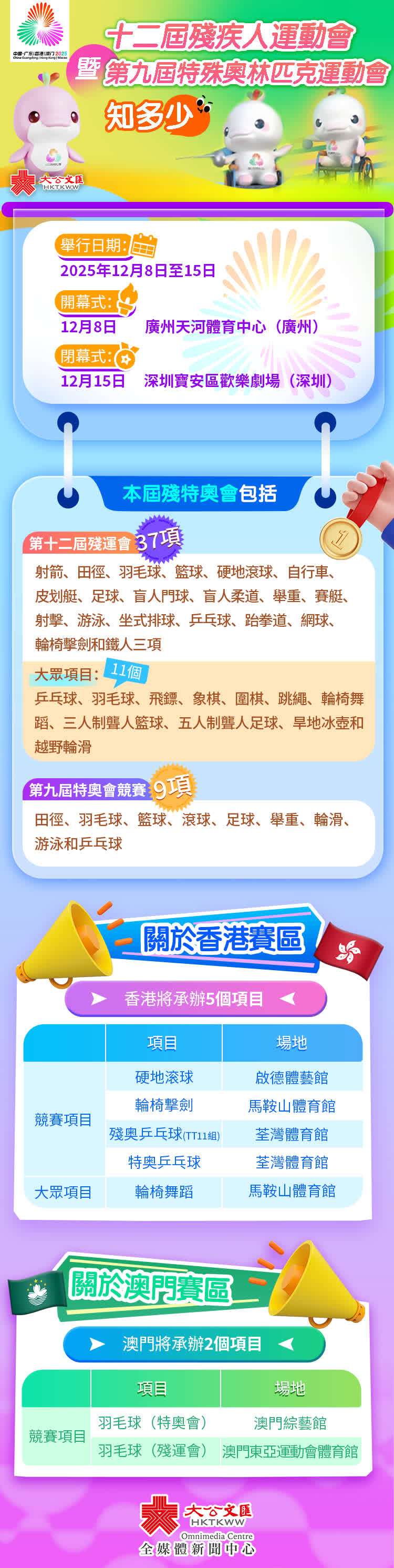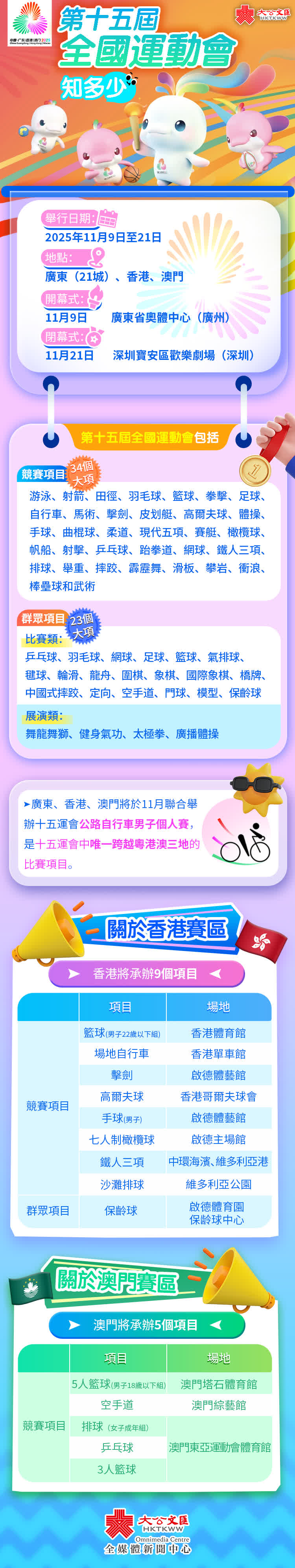 大公文匯全媒體報道,第十五屆全國運動會(十五運會)和全國第十二屆殘疾人運動會暨第九屆特殊奧林匹克運動會(殘特奧會)將分別於11月9日和12月8日開幕。開幕閉幕式將在哪裏舉辦?有哪些競賽項目?香港、澳門賽區有什麼看點?快來一圖了解!