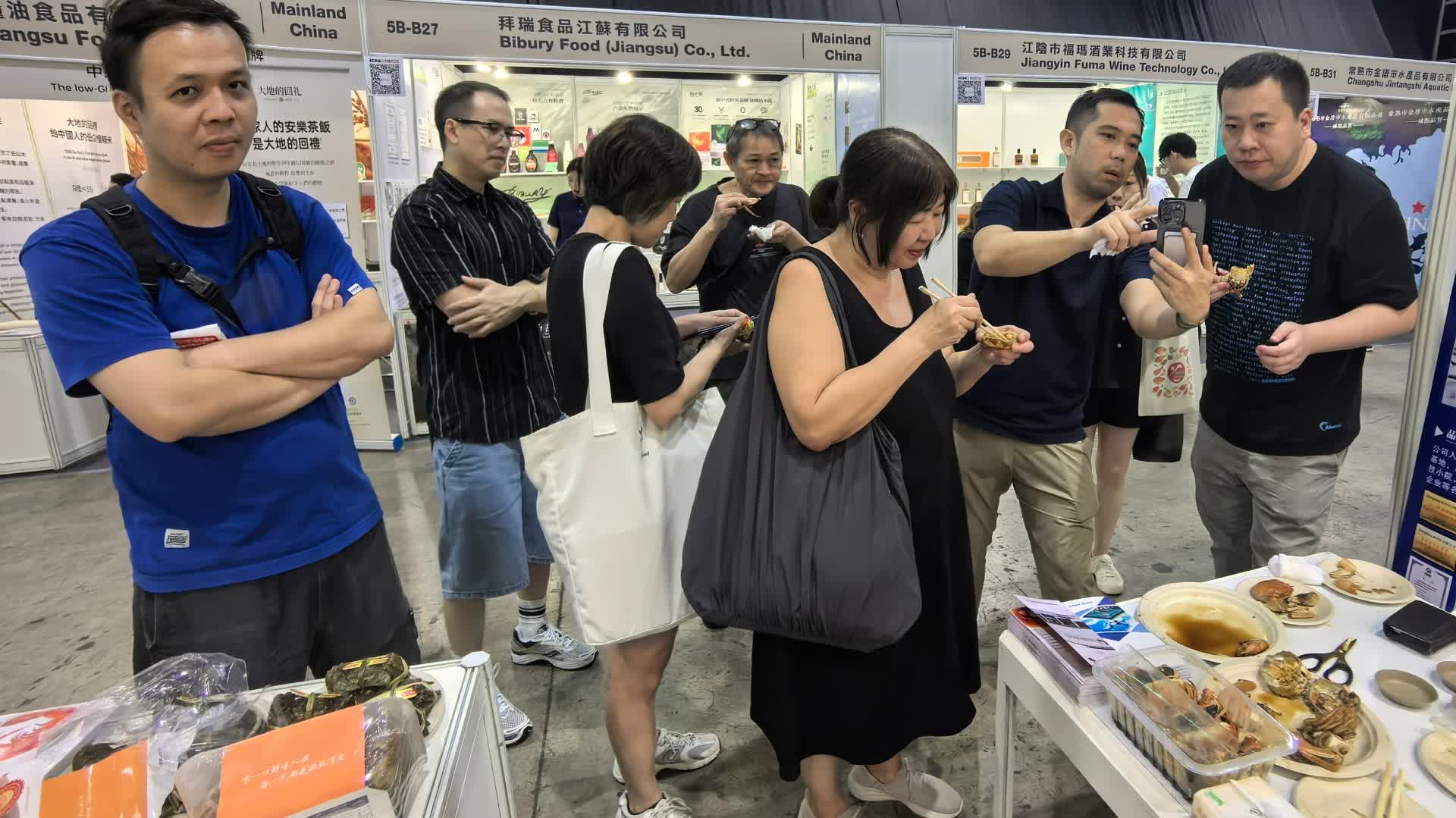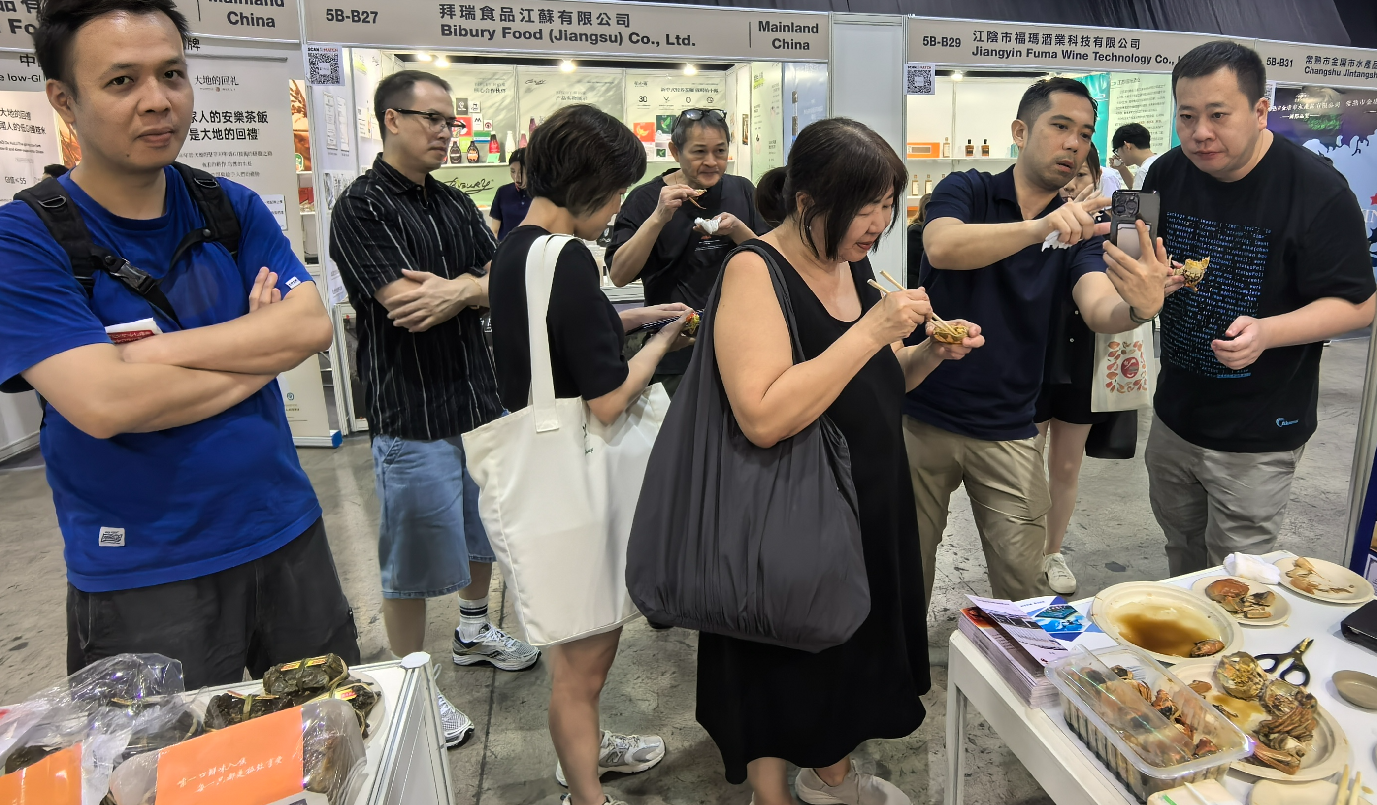 受颱風影響,原定8月14日上午十時開展的第35屆美食博覽改在下午兩點開展。開展一個小時不到,陽澄湖大閘蟹展位試吃區聚集了大量客戶,一度導致該區域明顯擁堵。李自強介紹道,這次來香港參展,他們還特別帶來花雕熟醉六月黃、花雕熟醉大蝦,供現場試吃。「客戶試吃下來,都誇我們的產品大蝦肉緊緻、入味,蟹肉鮮甜、醇香,質量好、口味好。」李自強說道。