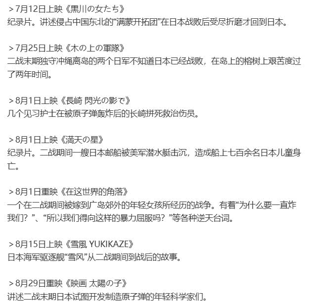 有網友統計,近期日本上映/重映的二戰題材相關電影至少7部,這還不包括日本各大電視台拍攝的特別劇集和所謂「紀念節目」。