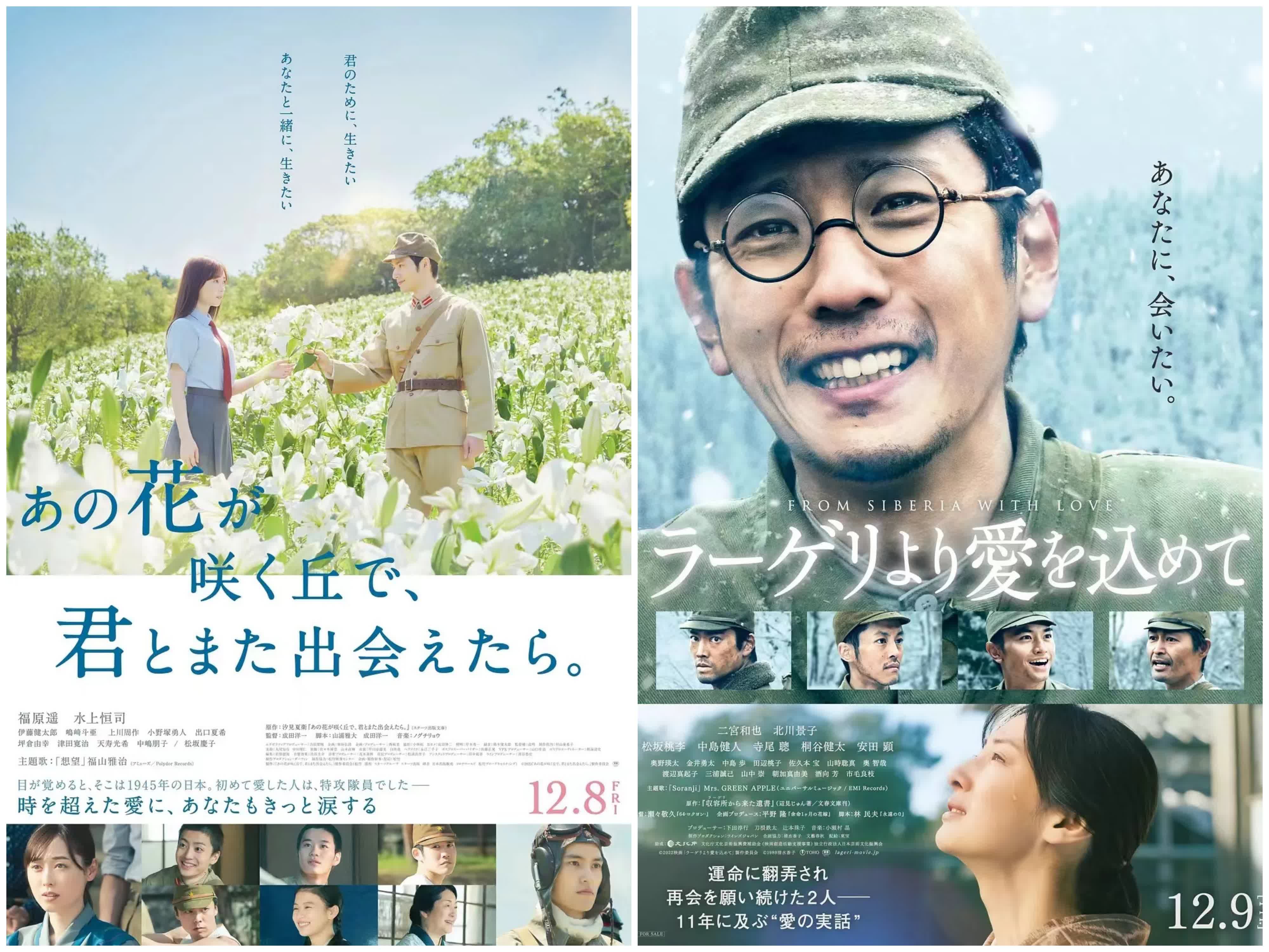 前兩年日本上映電影《在那開滿花的山丘,我想見到你》,講述一名現代女高中生意外穿越到1945年的日本,被特攻隊員所救並相愛;《來自收容所的遺書》則以二戰後的西伯利亞戰俘營為舞台,講述男主角在西伯利亞收容所面對食物匱乏、蘇聯軍方不人道對待、日本戰俘內部的階級欺凌以及西伯利亞嚴苛氣候等殘酷環境,堅信自己能夠回國與妻兒團聚的故事。