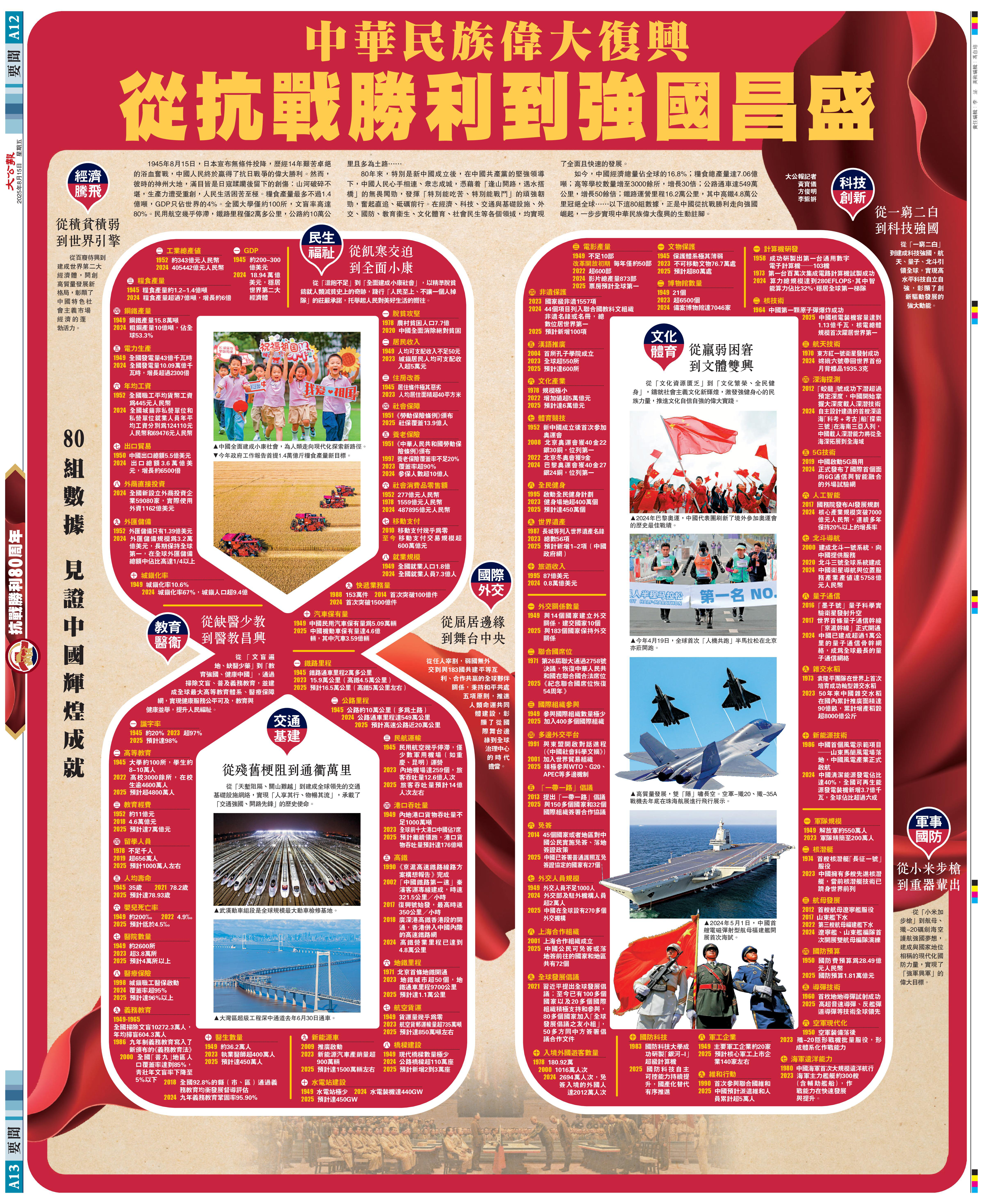 80年來,特別是新中國成立後,在中國共產黨的堅強領導下,中國人民心手相連、眾志成城,憑藉着「逢山開路,遇水搭橋」的無畏闖勁,發揮「特別能吃苦、特別能戰鬥」的頑強韌勁,奮起直追、砥礪前行。在經濟、科技、交通與基礎設施、外交、國防、教育衞生、文化體育、社會民生等各個領域,均實現了全面且快速的發展。