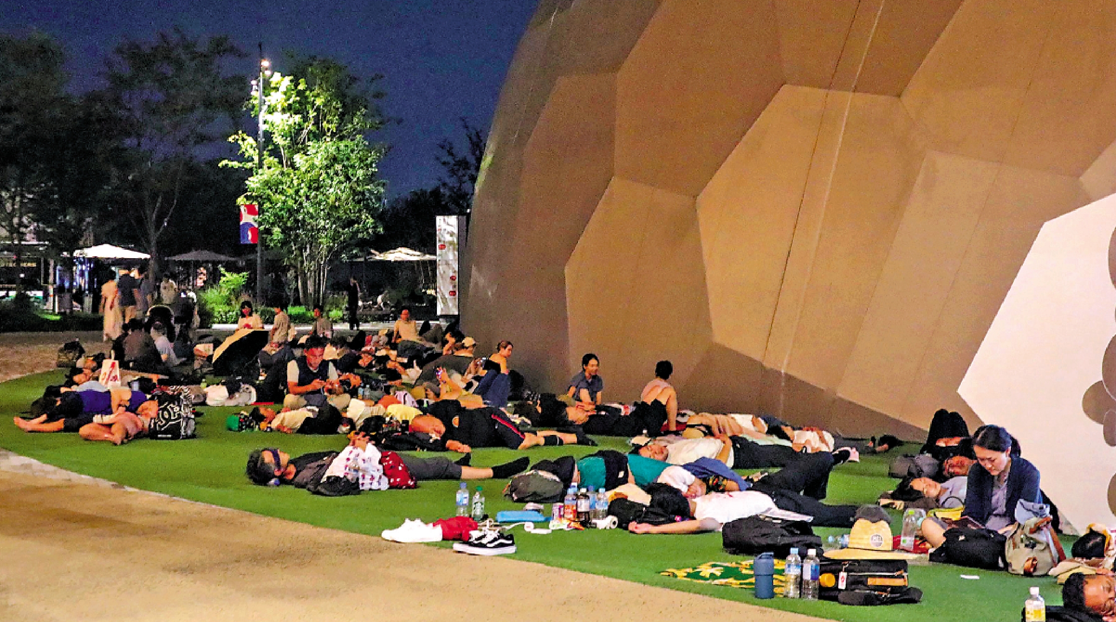 許多遊客在木製「大屋頂環」下的長椅過夜,或睡在變成避難所的涼亭裏。高崎市一名40歲婦女帶着兩個兒子躺在長櫈上過夜,她表示:「我一直很期待未來的世博會,但感覺就像一場災難﹗」