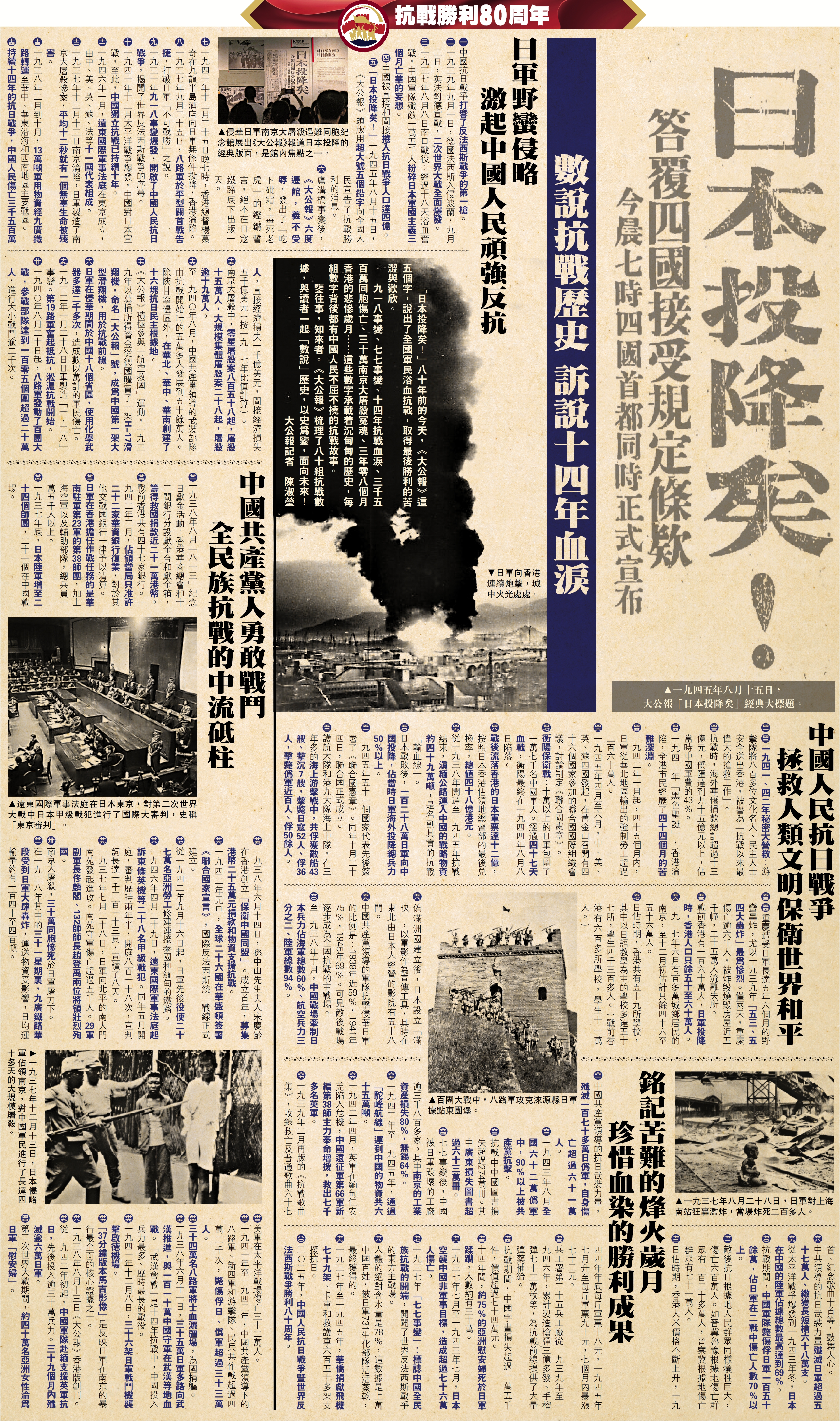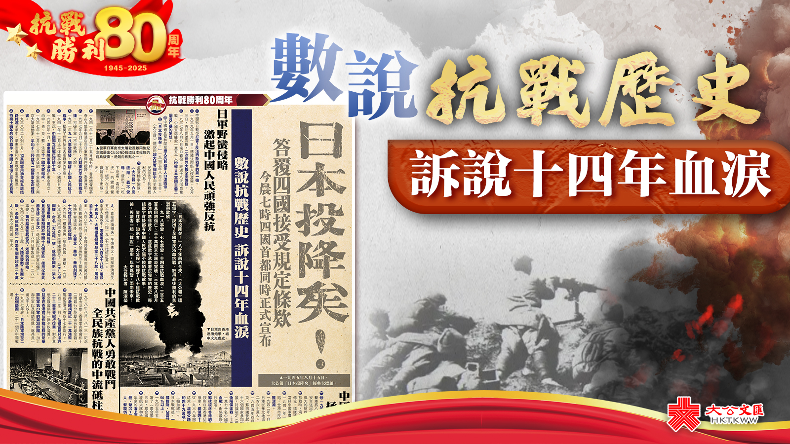 (大公報 記者 陳淑瑩)「日本投降矣!」八十年前的今天,《大公報》這五個字,說出了全國軍民浴血抗戰,取得最後勝利的苦澀與歡欣。