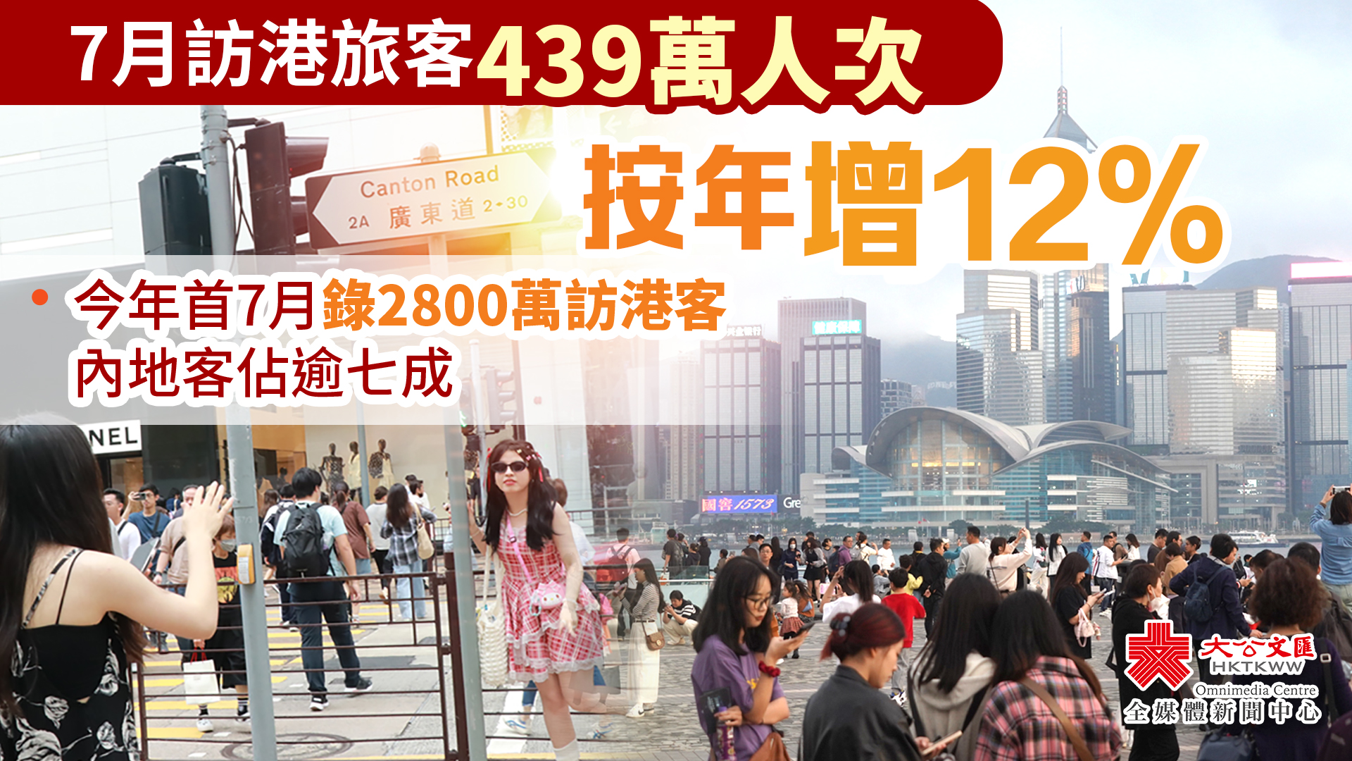 旅發局表示,7月來自短途客源市場的旅客人次按年上升12%,以日本、台灣地區表現較佳;長途市場旅客人次按年上升超過兩成,增幅主要來自英國、美國、澳洲、法國及德國。