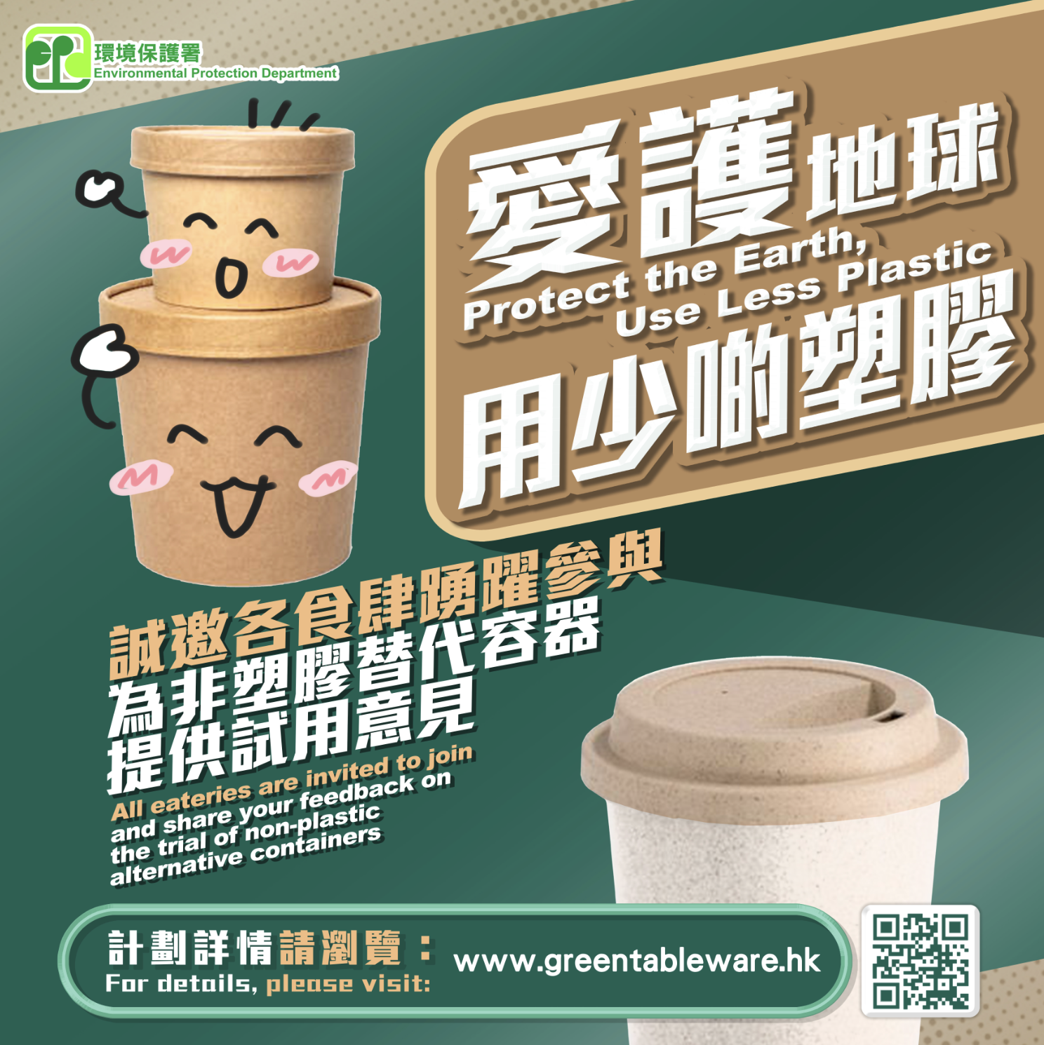 環保署呼籲餐飲業界踴躍參與試驗計劃,為環保出一分力。有關計劃詳情和參加方法,請瀏覽「綠色餐具平台」網站,或電郵至sup_hotline@epd.gov.hk查詢。