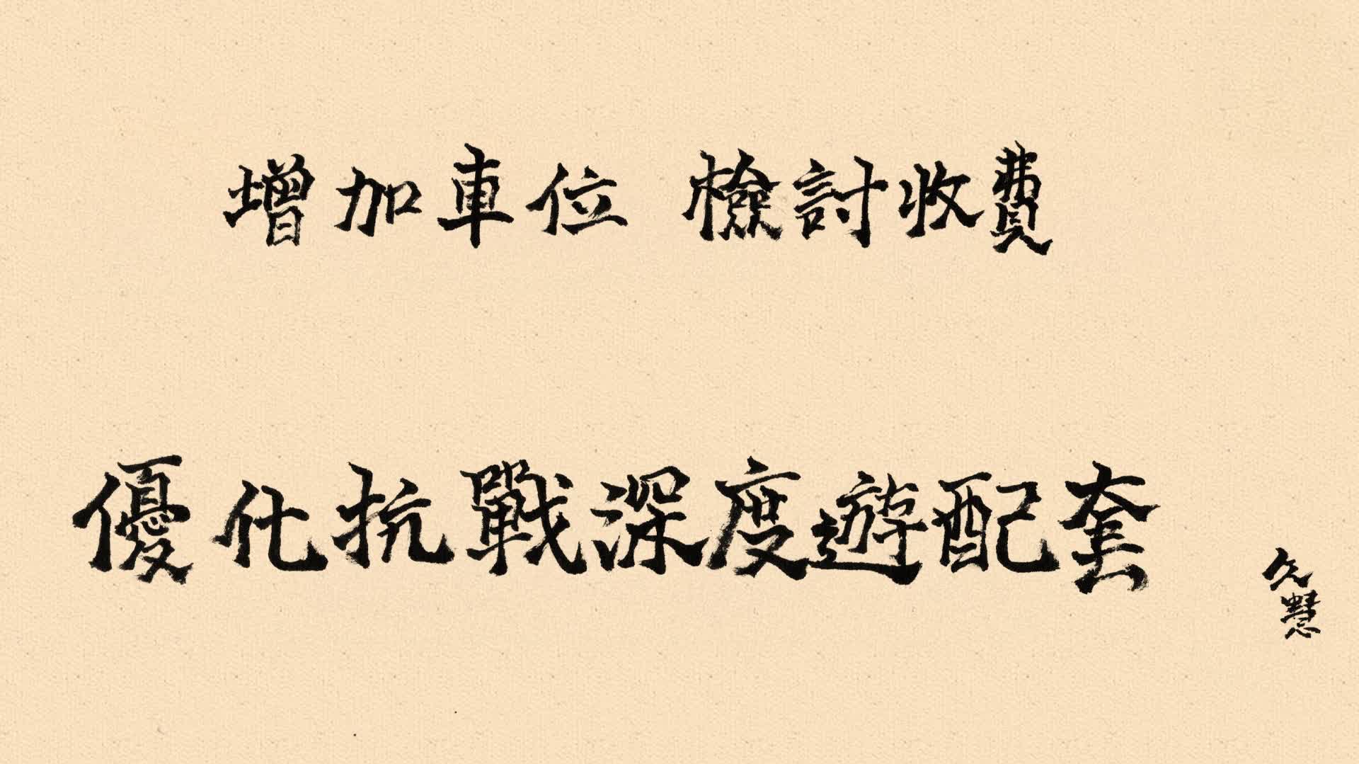 參觀抗戰景點,要麼是團體或學校組織前往,那就涉及旅遊巴的停車需求;要麼市民自行驅車前往,也需要解決私家車的泊位;若市民承搭公共交通工具,再步行前往古蹟,因當年抗戰需要,不少遺址位於偏僻郊外山林,步行距離可能頗長,老幼未必吃得消,而當局亦未有計劃設「抗戰巴士」專線,專門循環於各遺址之間,或者設接駁巴士直達古蹟鄰近的交通樞紐。此外,「粵車南下」正在分階段逐步推行,料未來自駕進行深度遊的旅客將逐步上升,須研究增加景點停車位,便利遊客與市民前往參觀。