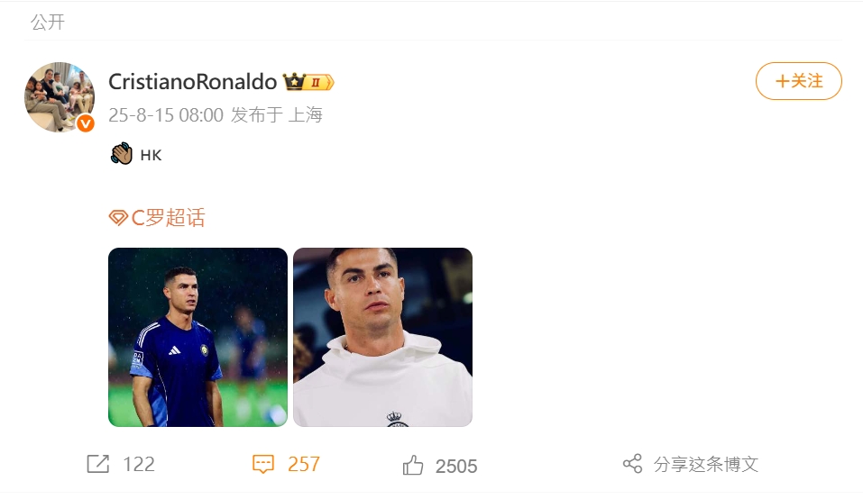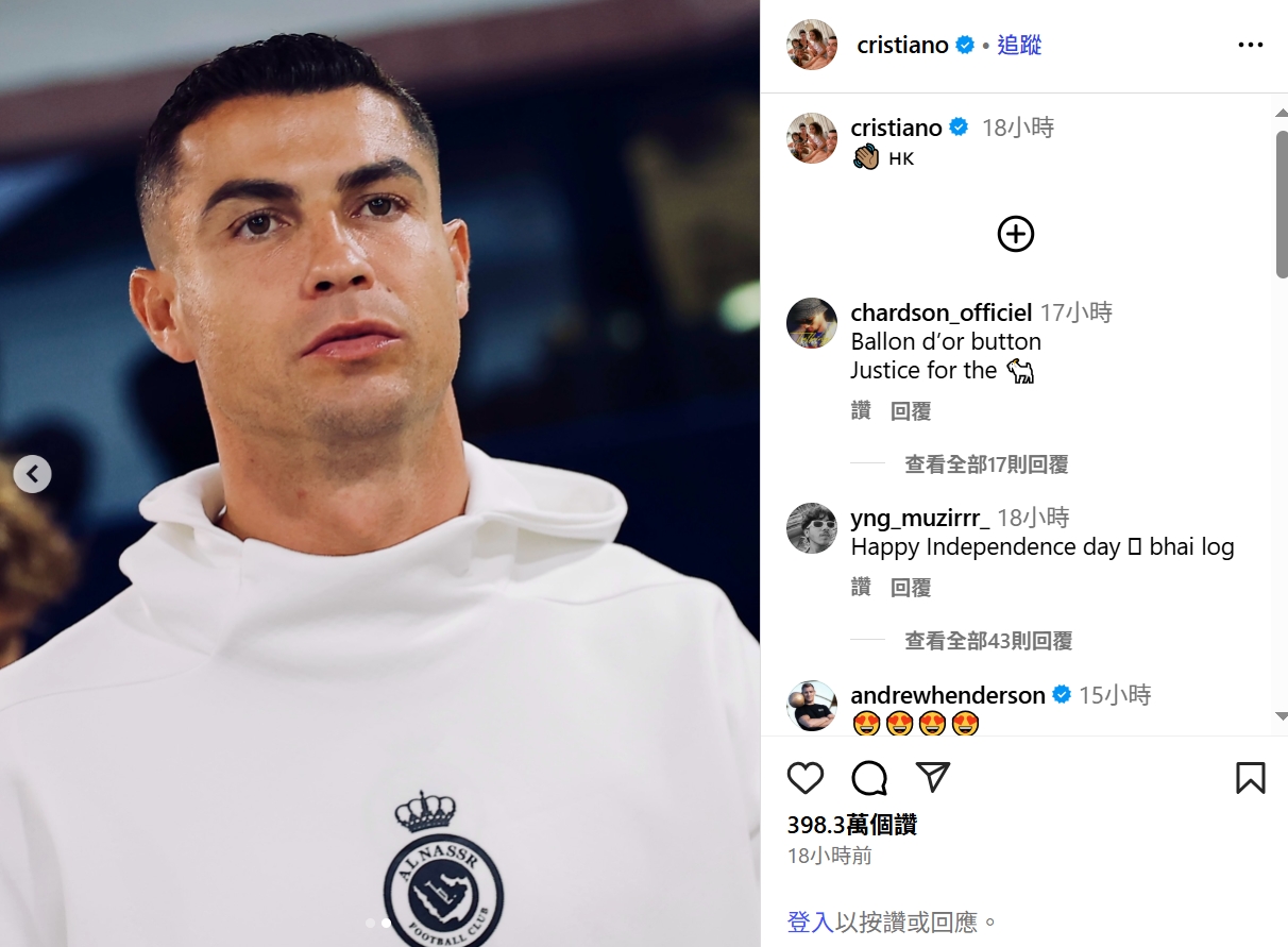 同時,C朗昨晚和今(15日)早還分別在IG和微博上載操練時的圖片,並配上揮手的表情符號,示意「你好香港」。另外,艾納斯官方發布球隊出發至香港的花絮,當中C朗對鏡頭向香港球迷喊話:「香港陣間見!(See you soon Hong Kong)」