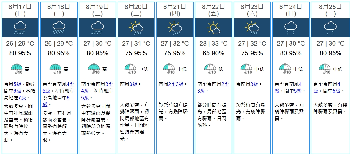天文台續指,與該低壓區相關的雨帶已影響廣東沿岸海域,隨着其北移,預料本港明日開始有狂風驟雨,稍後驟雨逐漸增多,海有大浪。預料星期一及星期二雨勢有時頗大及有狂風。