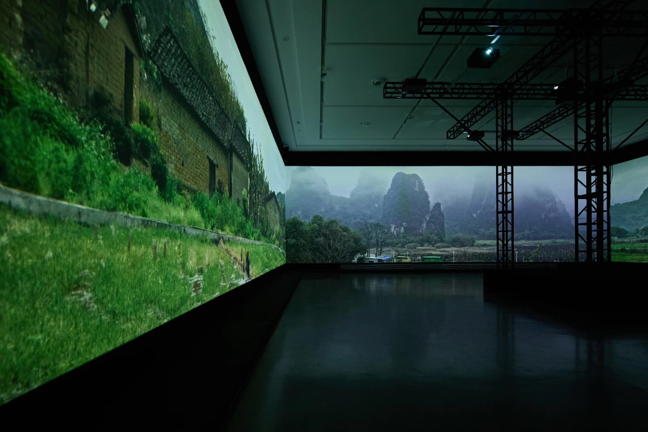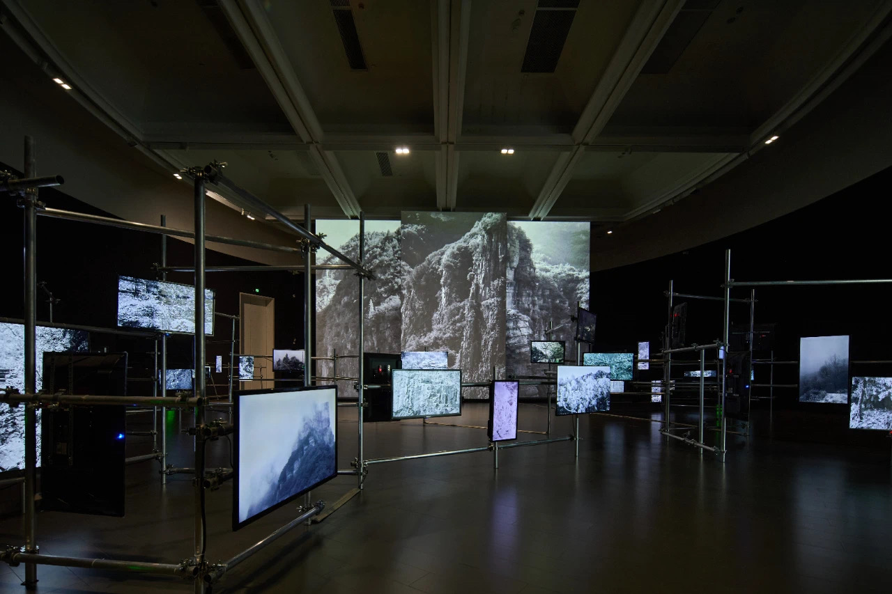 在第二章「遠山長,雲山亂,曉山青」中,幾十件影像裝置的迷宮繼續延伸,觀眾在「遊觀」途中可以沉浸觀看《山水:唐詩辭典》《山水:富春江作為方法》《山水:如何度過夜晚》三件作品。其中《山水:唐詩辭典》是山水影像創作集體從中國傳統山水畫切入山水精神,又循「詩畫同源」之理路追溯山水詩的脈絡。創作以詩的邏輯運作時間與空間,同時用詩歌、繪畫、影像三種媒介展開空間影像敘事,營造詩意氛圍,化山水與山水畫意為空間詩意。