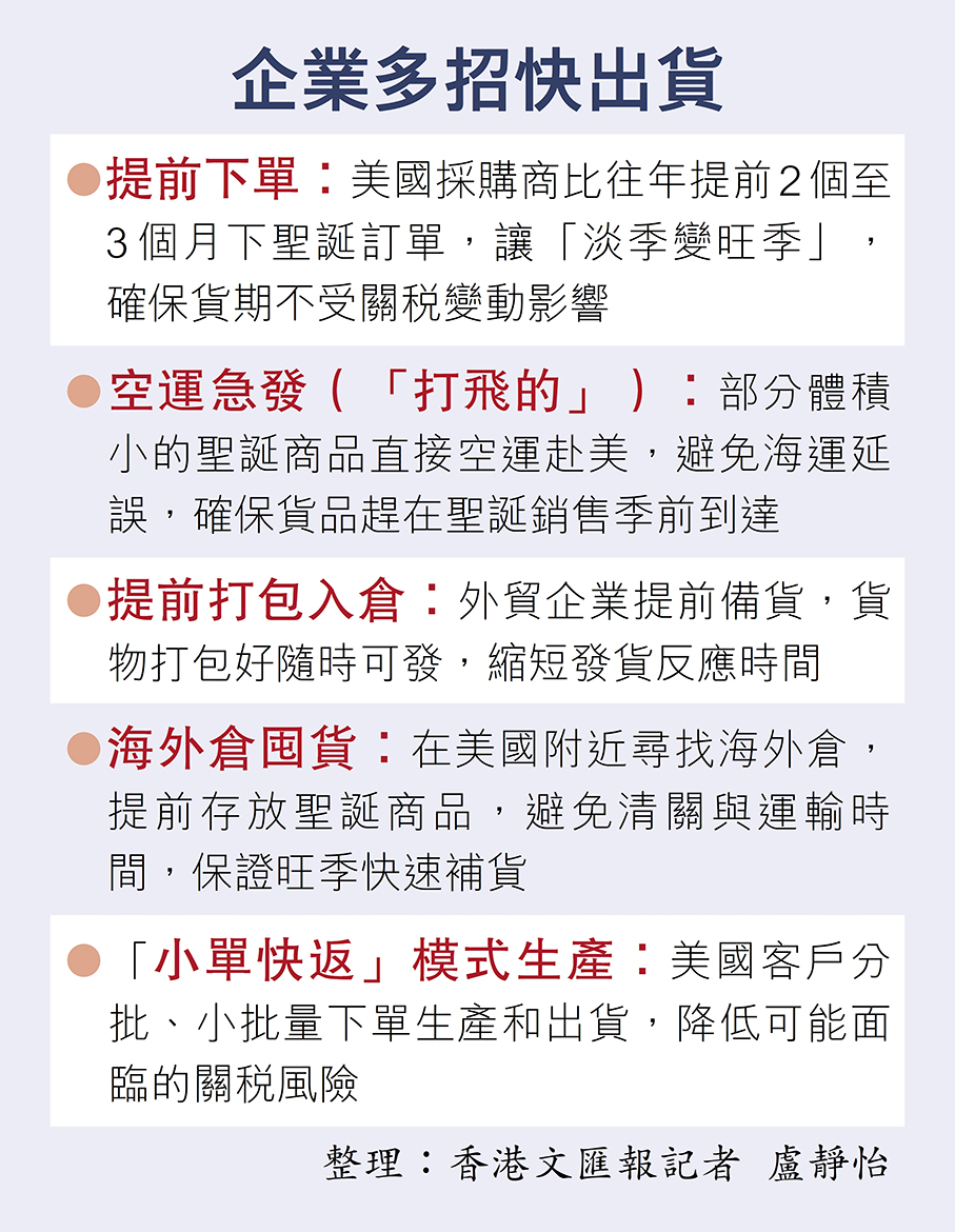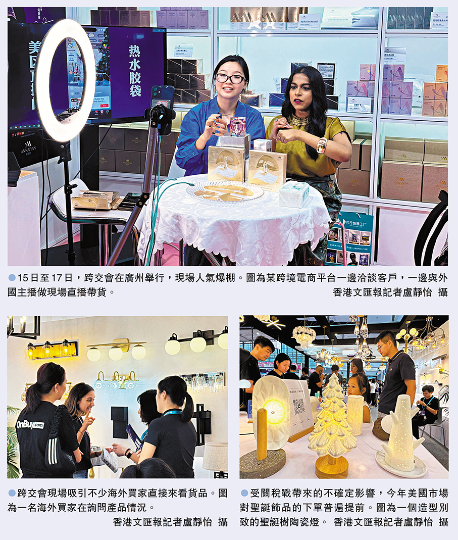 跨交會現場處處人山人海,不少展位前買家問詢不斷,氣氛非常熱烈。香港文匯報記者留意到,這是近期少見的火爆展會。本屆跨交會展覽面積超4萬平方米,超過1,000家優質供應鏈企業參展,同時還有42家跨境電商平台來攬客。在關稅戰背景下,有企業提前打包入倉隨時發貨, 有廠商計劃在美國附近設立海外倉囤貨,還有通過「小單快返」模式靈活出貨,甚至有聖誕飾品「打飛的」空運赴美。