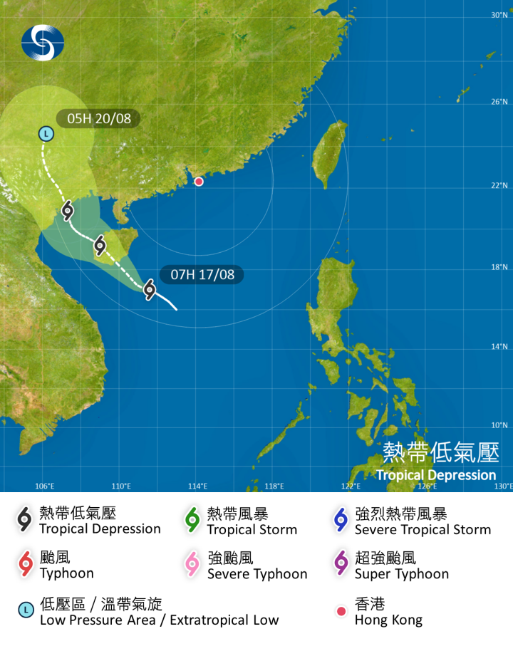 天文台表示,按照現時預測,該熱帶低氣壓會在今早與本港保持約600公里或以上距離,一號戒備信號會至少維持至正午12時。受熱帶低氣壓與中國東南部的高壓脊共同影響,本港離岸及高地間中吹強風。隨着該熱帶低氣壓移向海南島一帶,本港風力會在今日稍後有所增強。天文台會視乎該熱帶低氣壓與本港的距離及本地風力變化,評估是否需要在今日正午12時至下午6時改發三號強風信號。