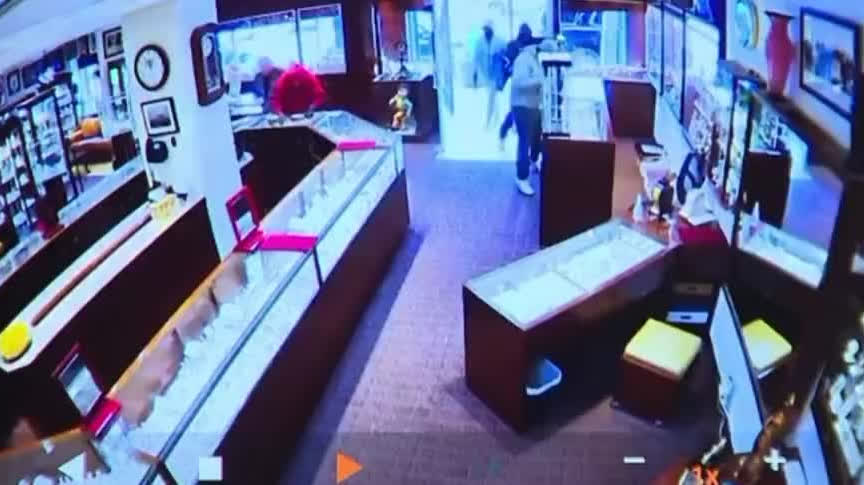 據美聯社公布的監控畫面顯示,4名蒙面嫌犯用鎚子砸破了珠寶店緊鎖的前門玻璃,隨後這群劫匪砸碎6個玻璃展示櫃,搶走價值200萬美元的珠寶、鑽石和名表。