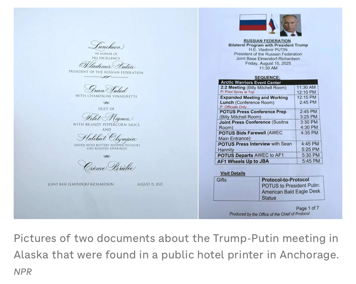 據美國國家公共廣播電台(NPR)報道,包含「特普會」細節的八頁官方政府文件於當地時間15日被遺留在埃爾門多夫-理查森聯合軍事基地附近酒店的打印機上。文件中包含了「特普會」當天的詳細行程安排、三名美國官員的電話號碼,以及俄羅斯與會者的姓名發音指南,包括「普京總統(POO-tihn)」。