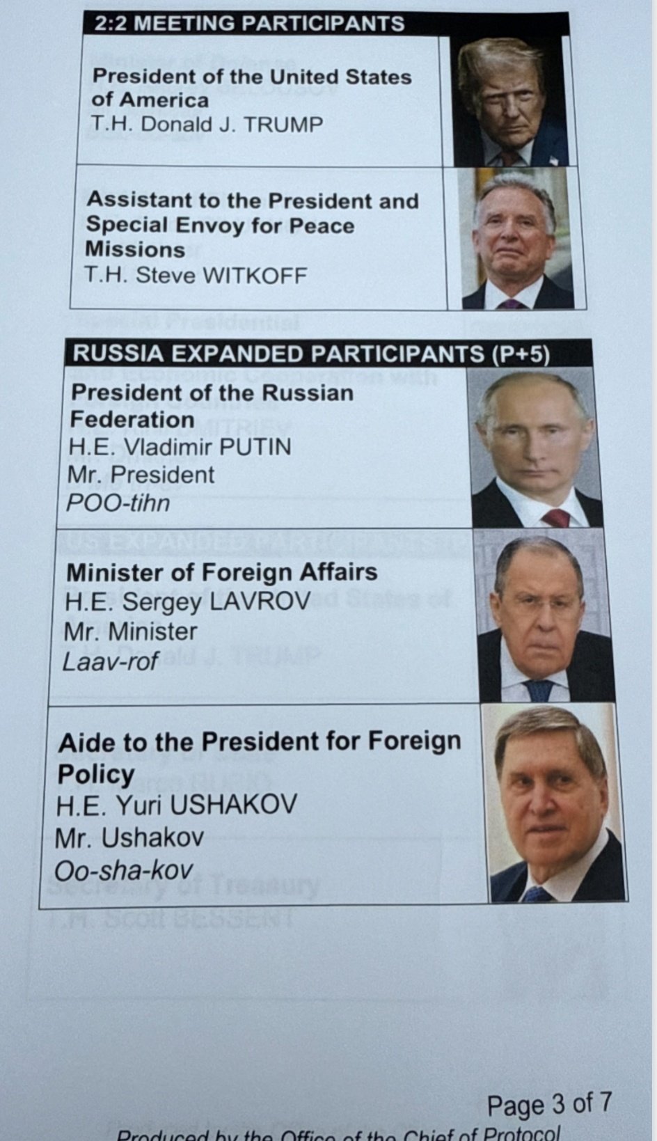 座位圖顯示,特朗普與普京對坐。特朗普身邊坐着美國國務卿馬可·魯比奧、國防部長皮特·赫格塞斯、白宮幕僚長蘇西·威爾斯、財政部長斯科特·貝森特、商務部長霍華德·盧特尼克以及和平任務特使史蒂夫·威特科夫。