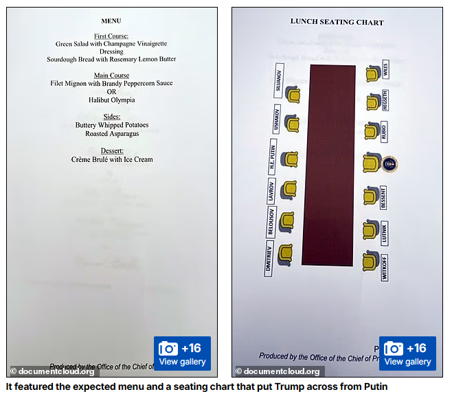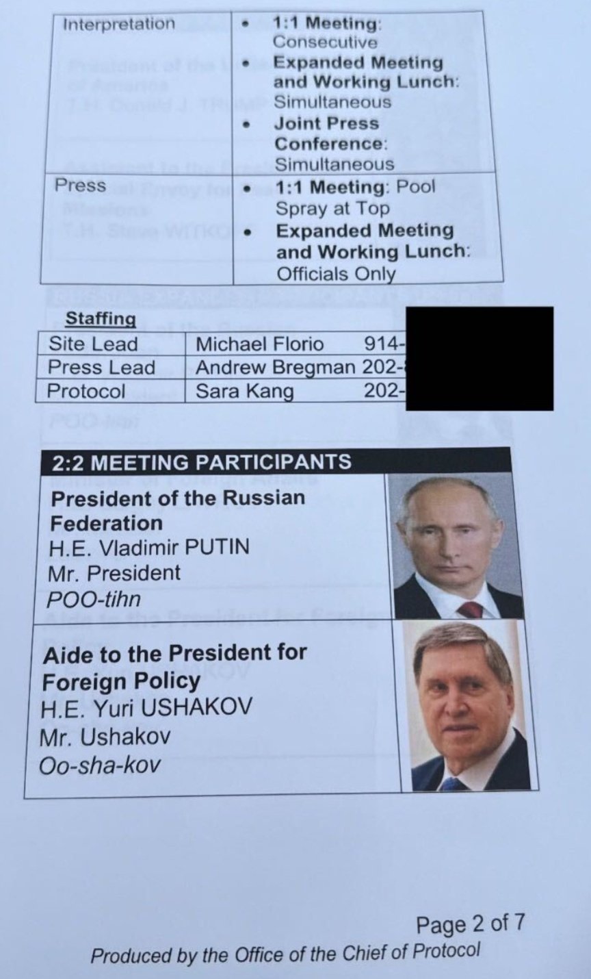 據NPR報道,文件第一頁顯示,特朗普和普京在基地內的「美國白頭鷹辦公桌雕像」附近會面;有三頁列出了美國和克里姆林宮官員的姓名,包括預計參加美俄元首峰會的所有俄羅斯人的發音指南;第六和第七頁提到,將為「尊敬的弗拉基米爾·普京閣下」舉行午宴。午宴菜單包括開胃菜為香檳醋汁沙拉,主菜為菲力牛排或大比目魚,配以土豆和蘆筍,甜點為焦糖布丁。