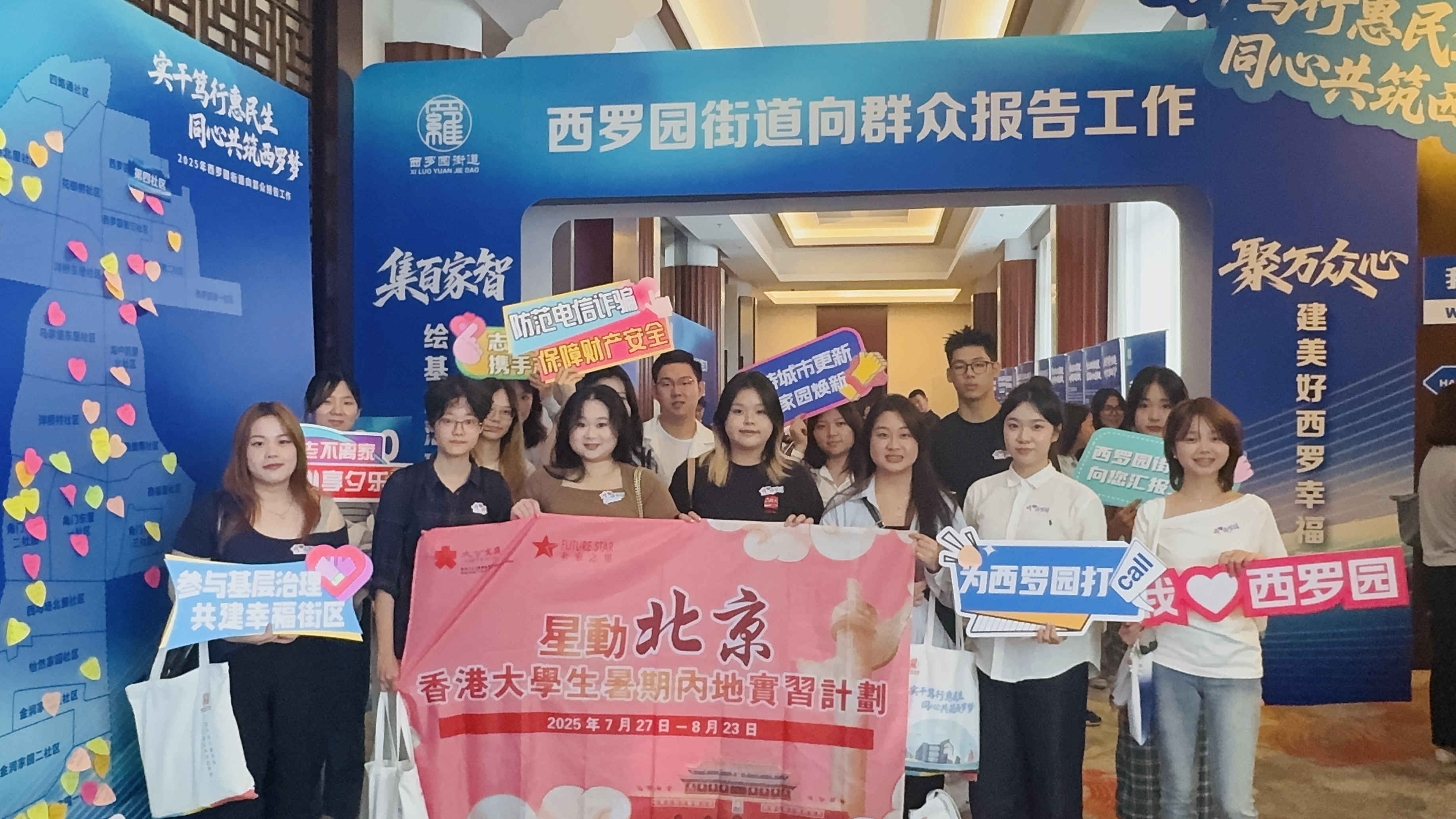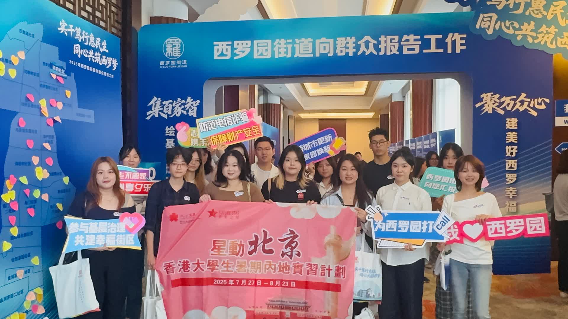 (大公文匯網 記者 李暢、羅洪嘯 北京報道)參加「星動北京·未來之星香港大學生暑期實習計劃」的香港大學生15日走進北京豐台區西羅園街道,在「豐台·學子回家」行動的支持下現場觀摩「街鎮向群眾報告工作」活動,深入了解首都基層治理。當日,西羅園街道領導班子以「考生」身份集體亮相述職,在完成涵蓋老舊小區改造、社區養老服務等民生工程的匯報後,直面400名居民代表的「質檢」提問,港生則作為學子代表現場「監考」。港生們全程專注聆聽,街道工作人員專業又 「接地氣」 的匯報,讓香港學子對基層治理從陌生到熟悉。