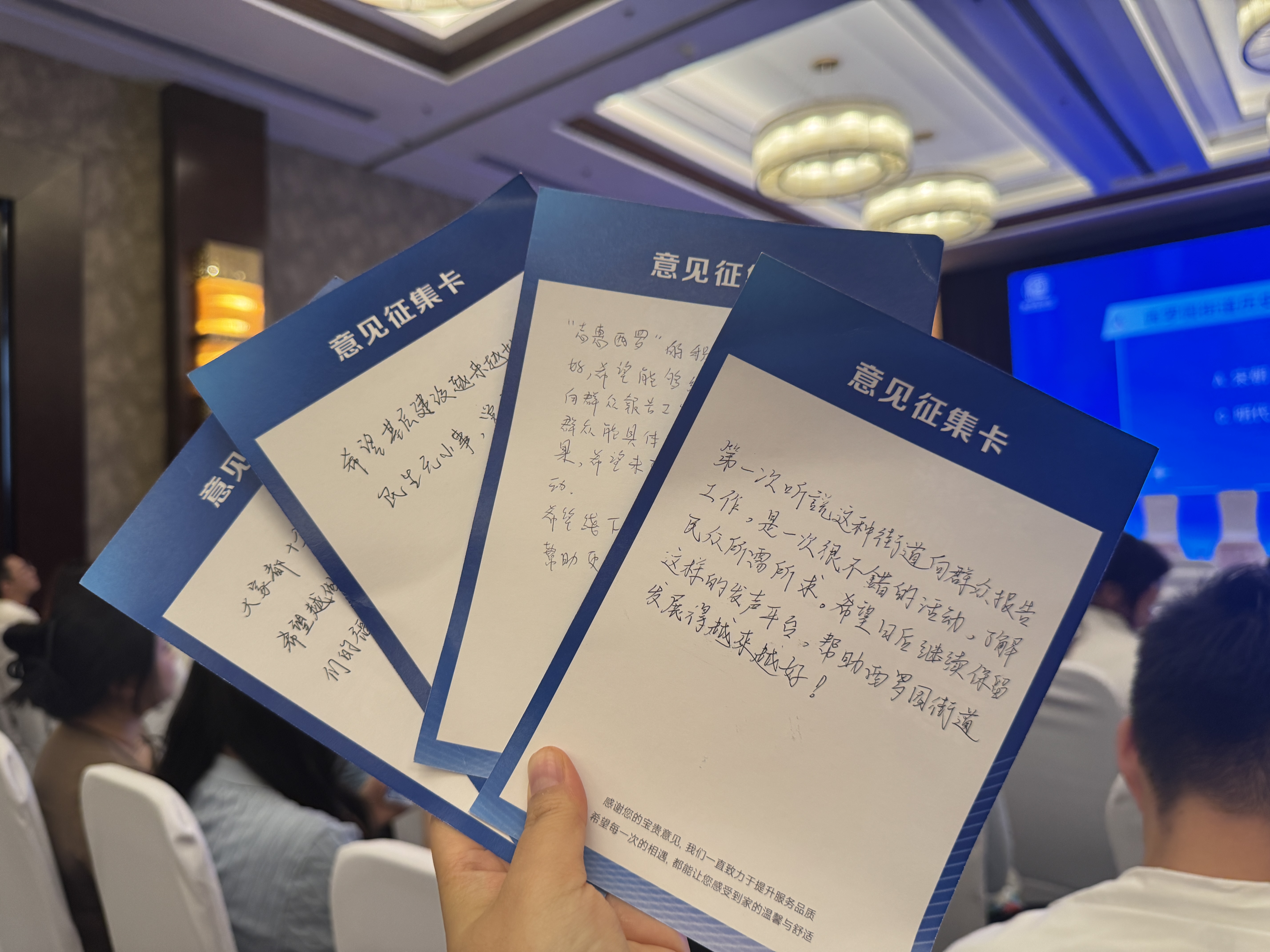 值得一提的是,這些來自香港的監考官們在活動結束後自發地在一張張意見徵集卡上認真書寫了自己對街道發展的「小期盼」,以年輕人的視角為社區建設獻計獻策。陳昱璆同學寫道:「志惠西羅」的積分小程序想法非常好,希望能夠繼續下去。她還建議街道開展更多場次線下招聘會,幫助更多有就業意願的失業人員重返職場。