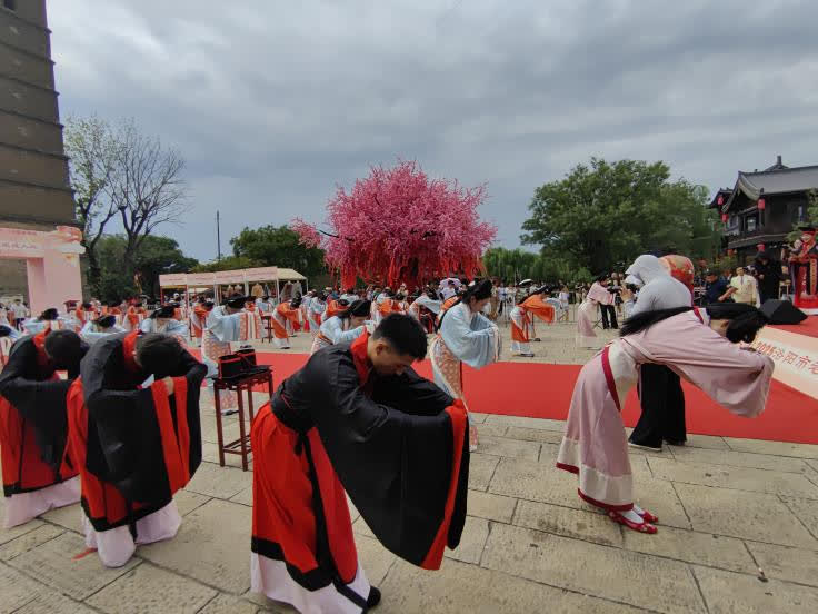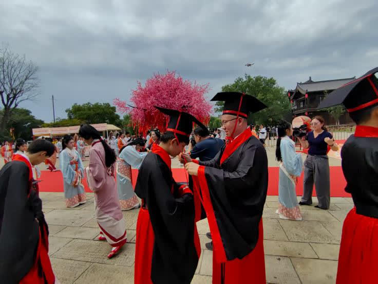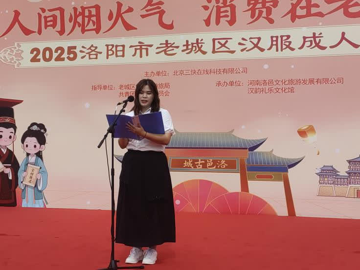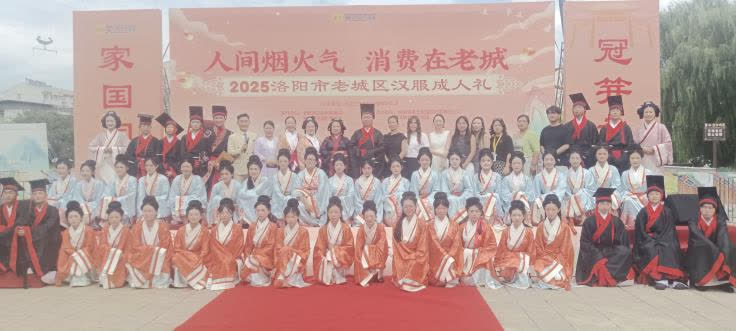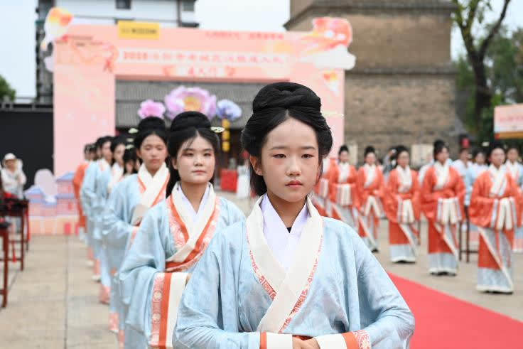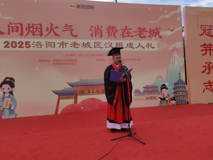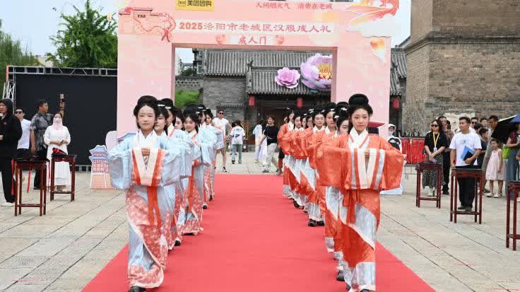 河南省洛陽市,2025年8月16日——文峰塔下,少女身着齊腰襦裙,衣袂飄飄;少年頭戴襆頭,身姿挺拔。在莊嚴的古樂聲中,他們緩緩踏上紅毯,向師長行揖禮、受「加冠」之儀。這一幕並非影視場景,而是由洛陽市老城區文化和旅遊局、共青團老城區委員會作為指導單位,美團主辦,河南洛邑文化旅遊發展有限公司、洛陽漢韻禮樂館承辦的「人間煙火氣·消費在老城——2025老城區漢服成人禮」活動現場的動人畫面。