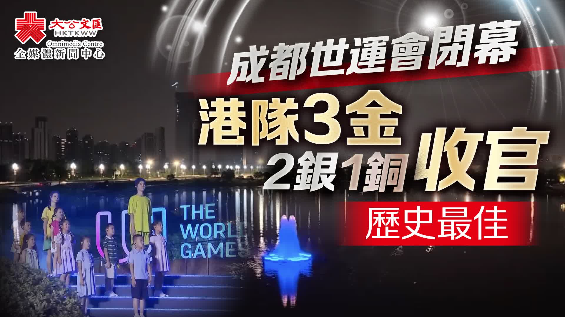 大公文匯全媒體報道,第12屆世界運動會今晚(17日)在成都閉幕。伴隨着童聲小合唱《友誼地久天長》,水火交融的主火炬熄滅。中國香港代表團今屆收穫3金2銀1銅歷史最佳戰績;中國代表團在主場取得36金17銀11銅,在金牌榜上位居第一。