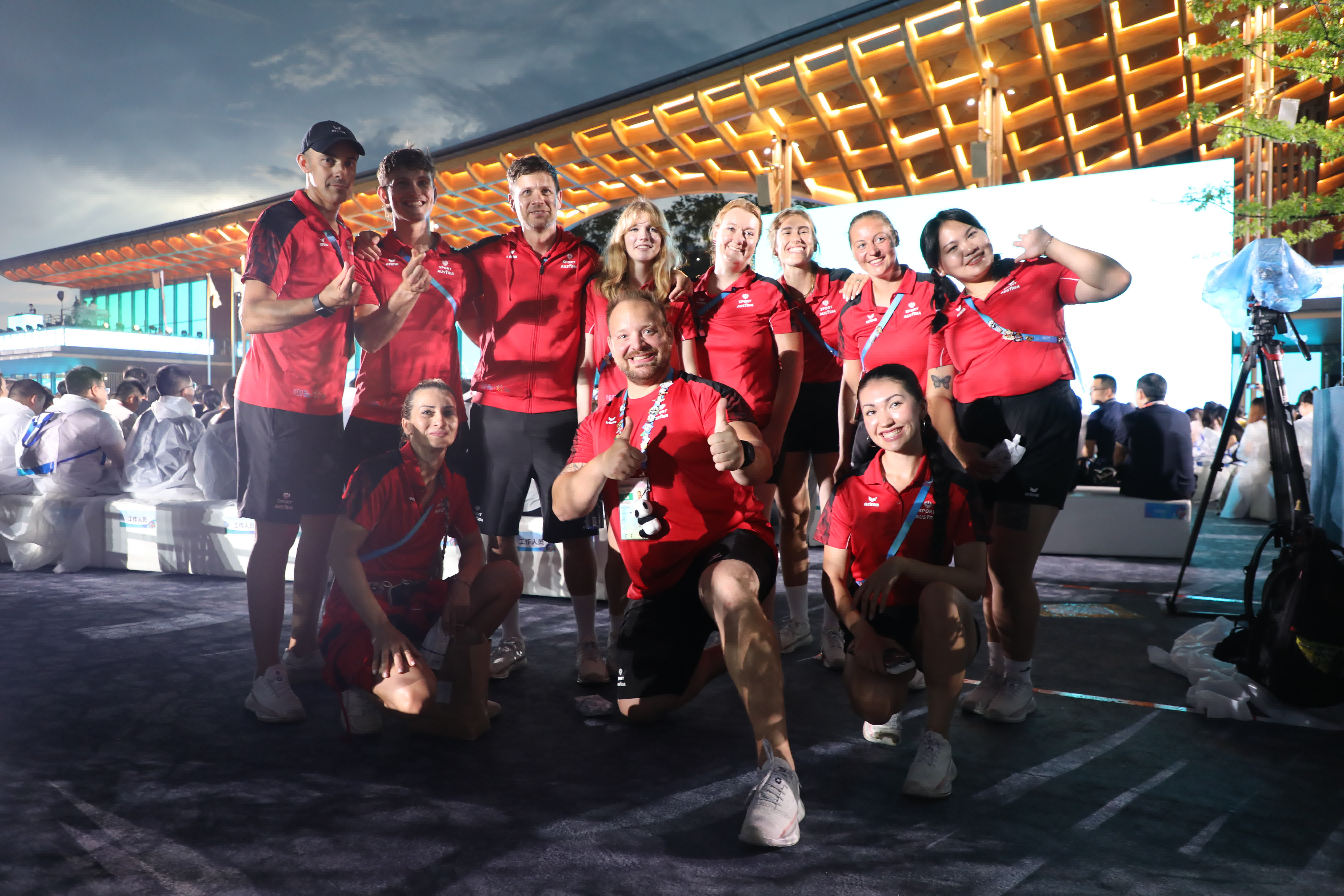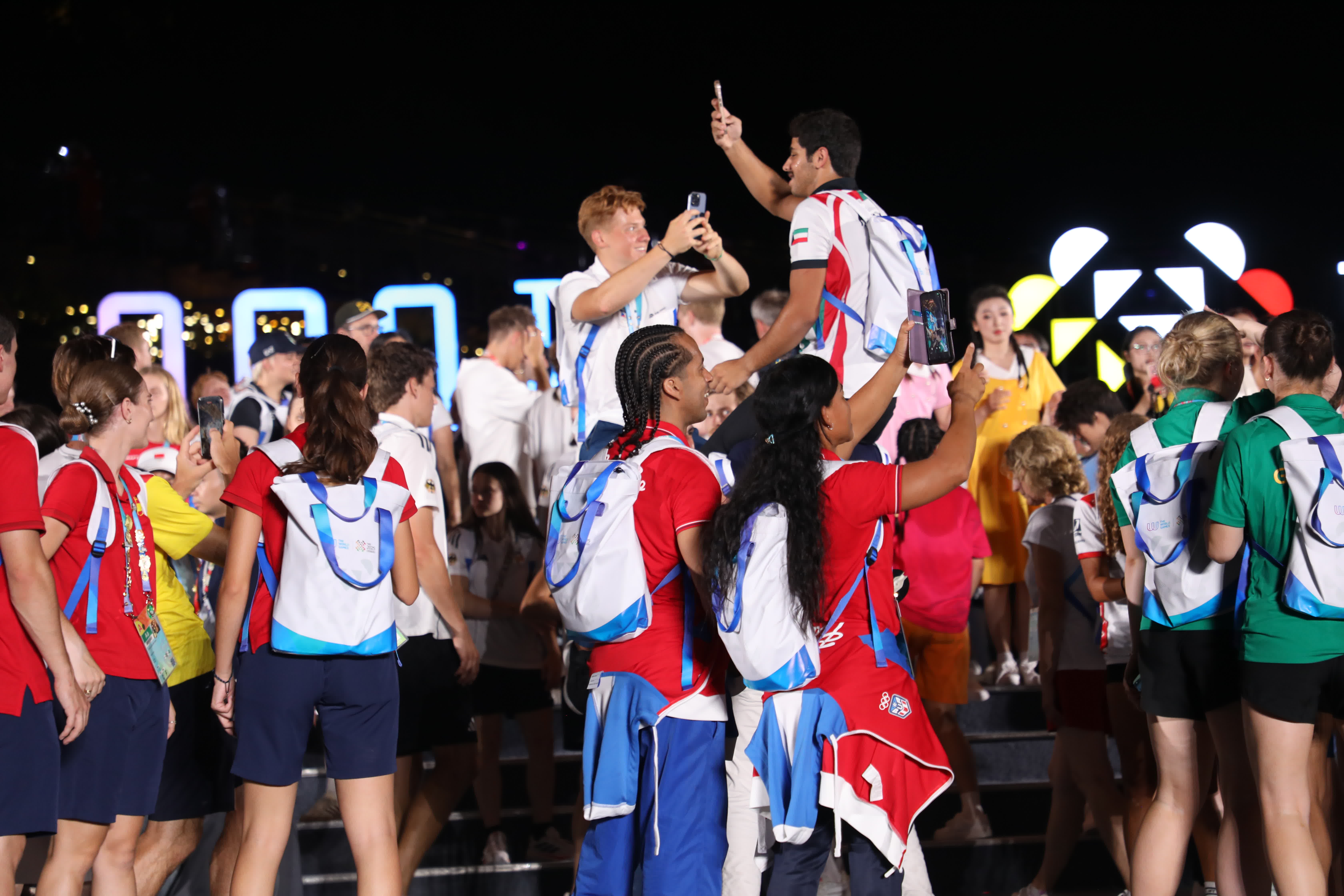 各代表團旗幟和運動員、志願者「小青椒」代表們入場,現場掌聲不斷,吶喊聲此起彼伏。和賽場上的緊張氛圍不同的是,來自全球的運動員不分國家和地區,攜手入場,卸下賽場疲憊,盡情享受着賽後的輕鬆時光。