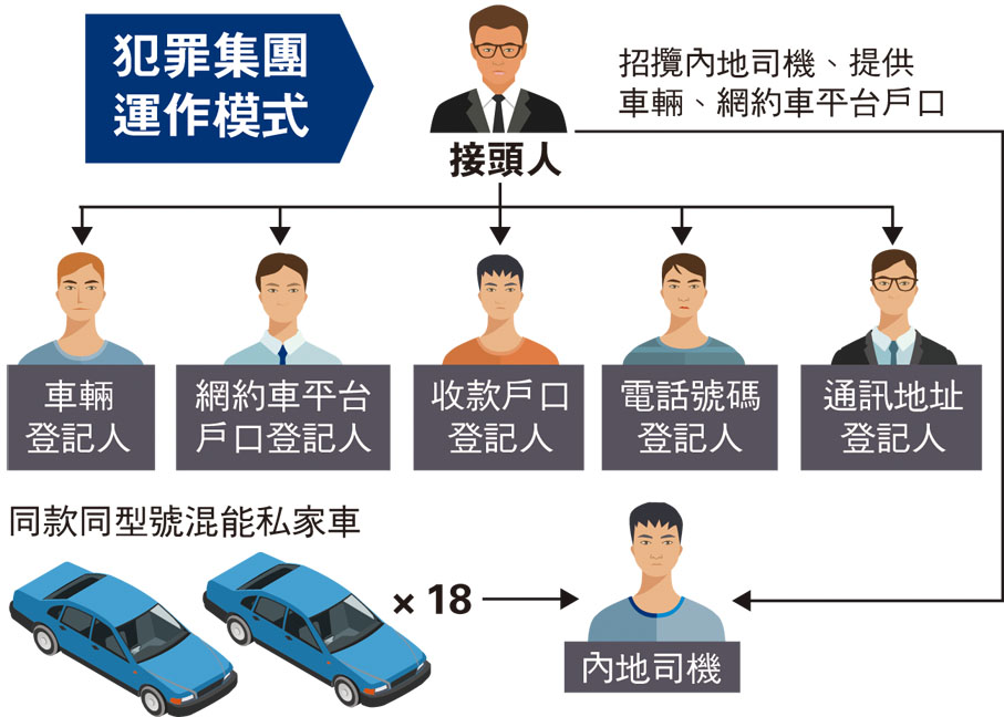 警方指該涉案集團分工精細,有成員負責車輛登記,在其名下位於九龍區的同一地址,總共登記了18輛同款、同型號的混能私家車,儼如一個私人車隊。此外,有成員充當網約車平台的戶口登記人,把名下的轉數快戶口、銀行戶口及電話號碼,在平台登記作為賬號,部分賬號更是利用偽造的香港身份證登記。