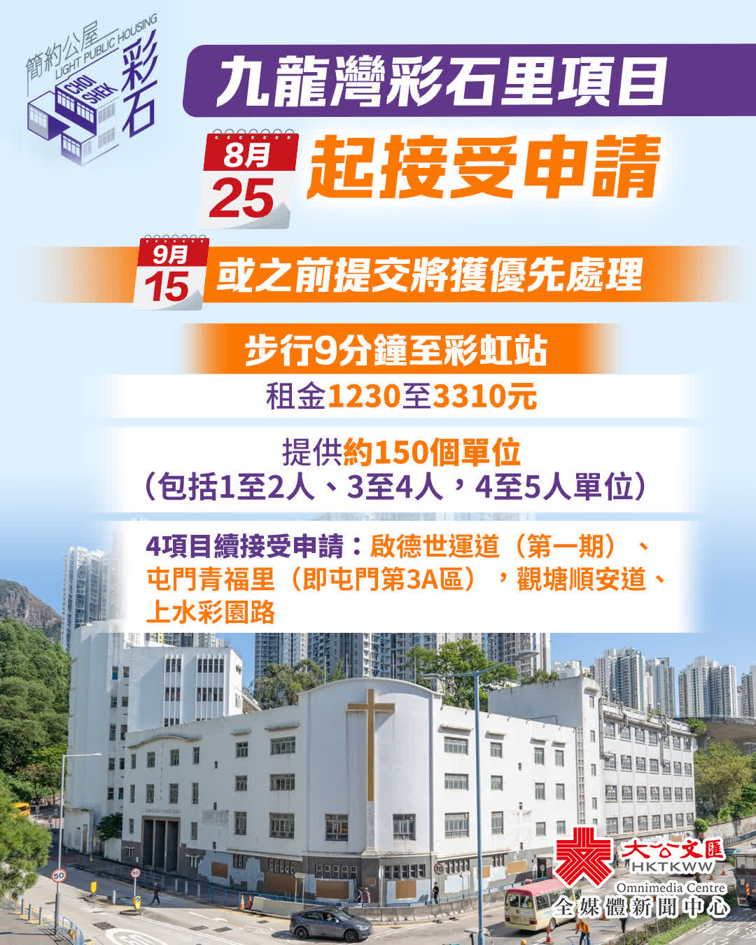 大公文匯全媒體報道,房屋局今日(18日)宣布,九龍灣彩石里「簡約公屋」項目將於8月25日起接受申請。項目由校舍改建,提供約150個單位,預計2026年第一季起陸續入伙。九龍灣彩石里項目提供約150個單位(包括一至二人、三至四人,以及四至五人單位),步行約9分鐘至港鐵彩虹站,附近亦設多條專營巴士及小巴線往返港九及新界不同地區,預計每月租金約1,230元至3,310元(註:視乎單位面積及地區,租金參考同區新落成傳統公屋租金約90%。因應傳統公屋租金一般每兩年檢討一次,相關租金亦會有所調整)。