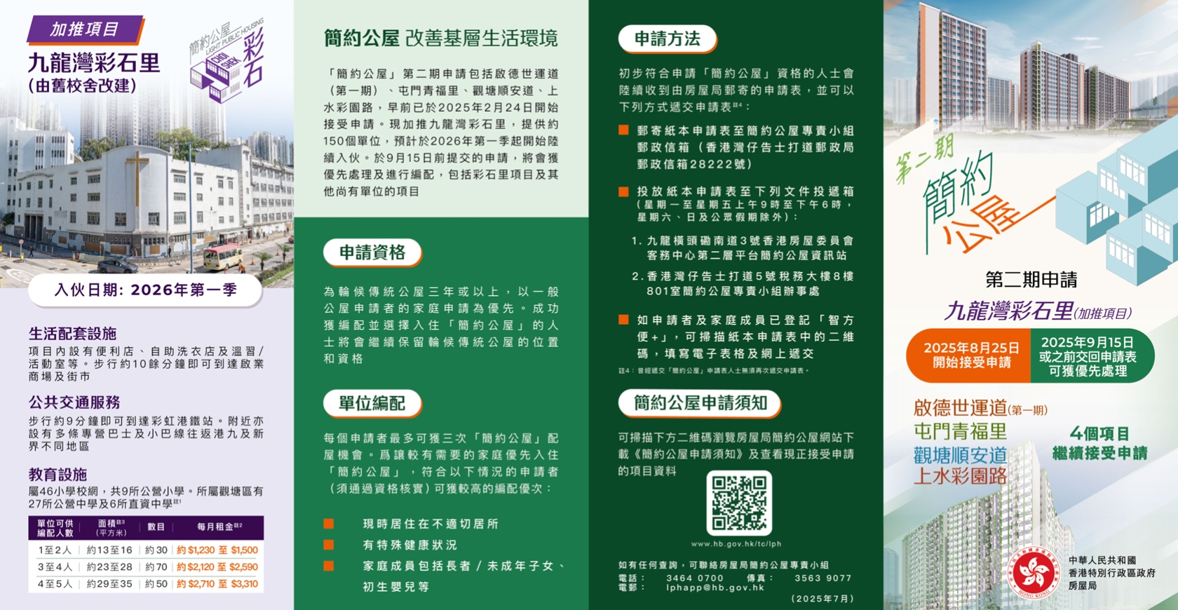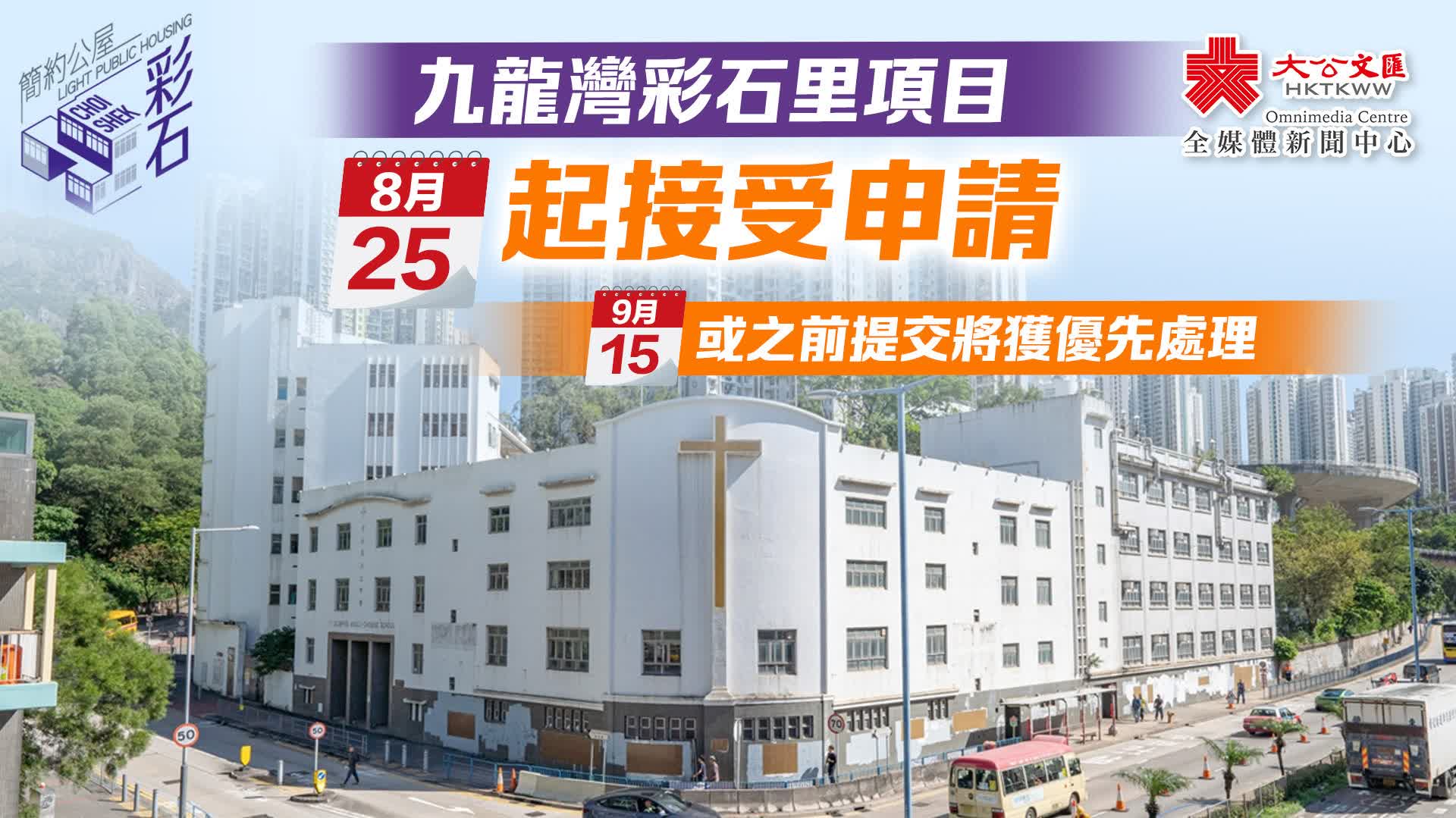 - 申請日期:在8月25日至9月15日期間交回填妥的申請表將會獲優先處理及進行編配,包括彩石里及其他尚有單位的項目;房屋局在9月15日後仍會繼續接受申請。